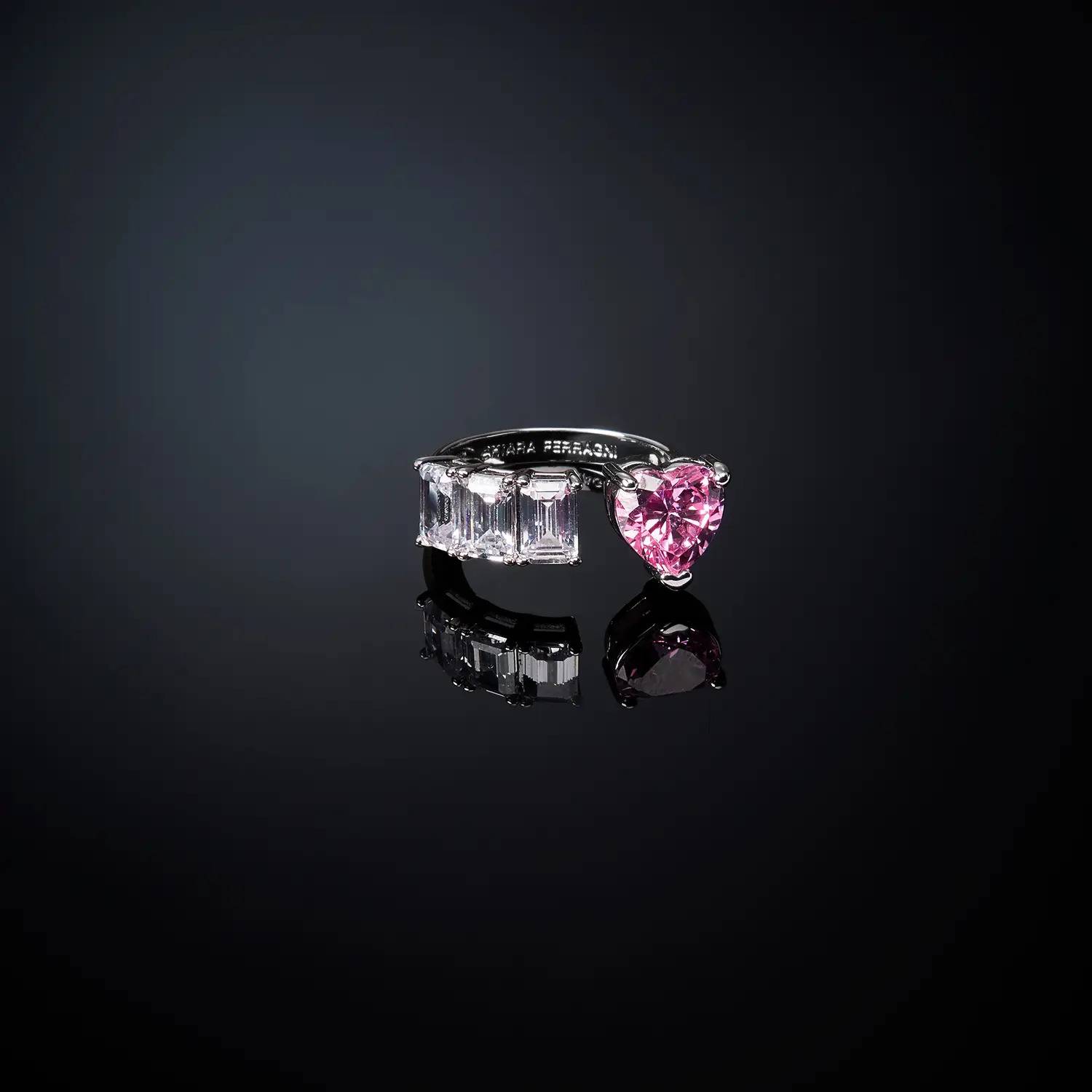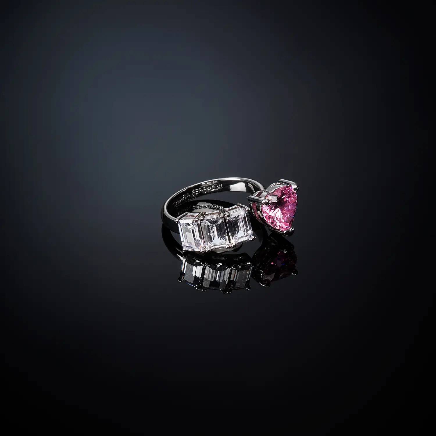 Women's ring from the Chiara Ferragni Infinity Love collection. Rhodium-plated ring with baguette-cut white zirconia and a pink heart. Discover the updated Ferragni collection; they're a true must-have this season.