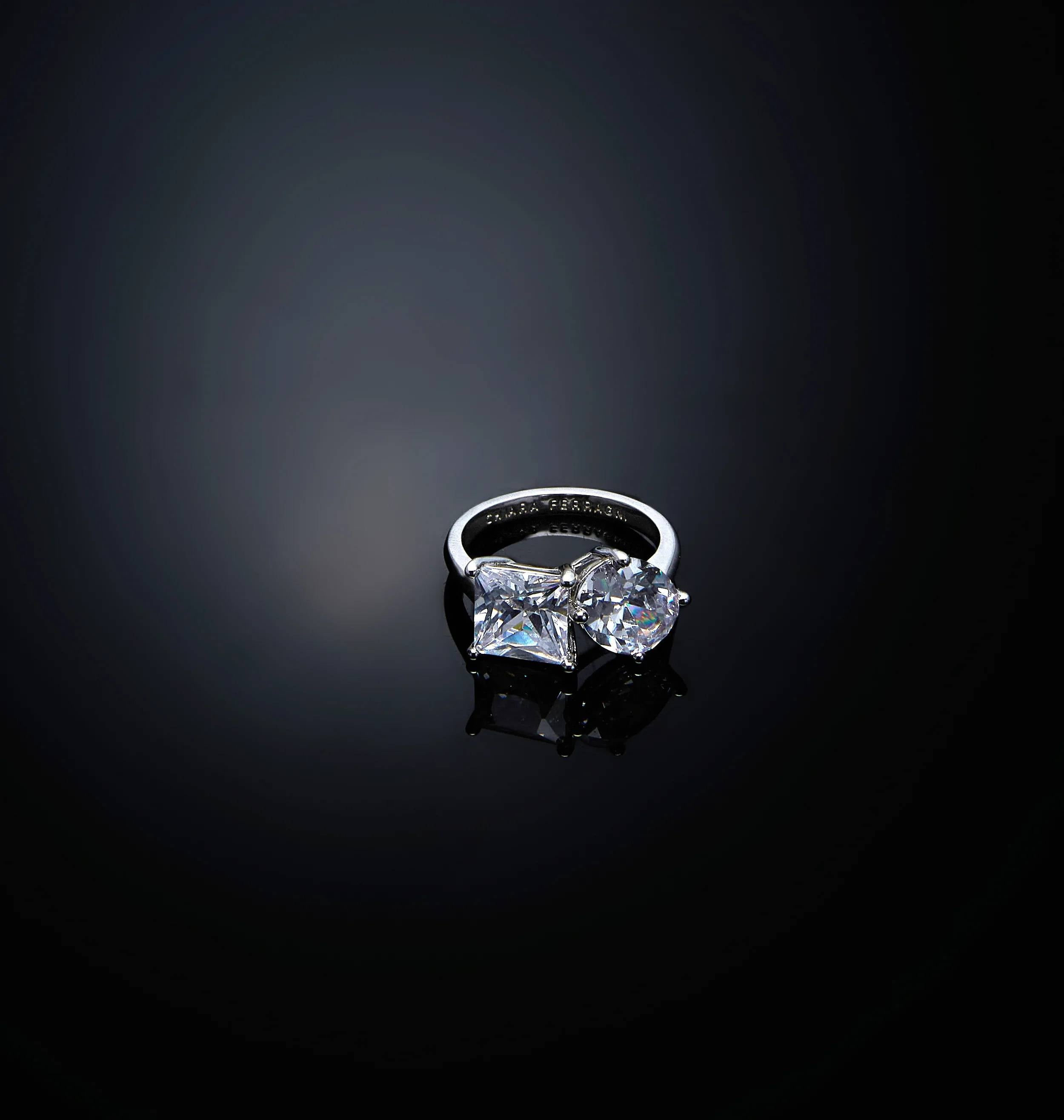 Women's ring from the Chiara Ferragni Princess collection. Rhodium-plated white zirconia ring, featuring an oval-cut stone and a square-cut stone. Discover the updated Ferragni collection; they're a true must-have this season.