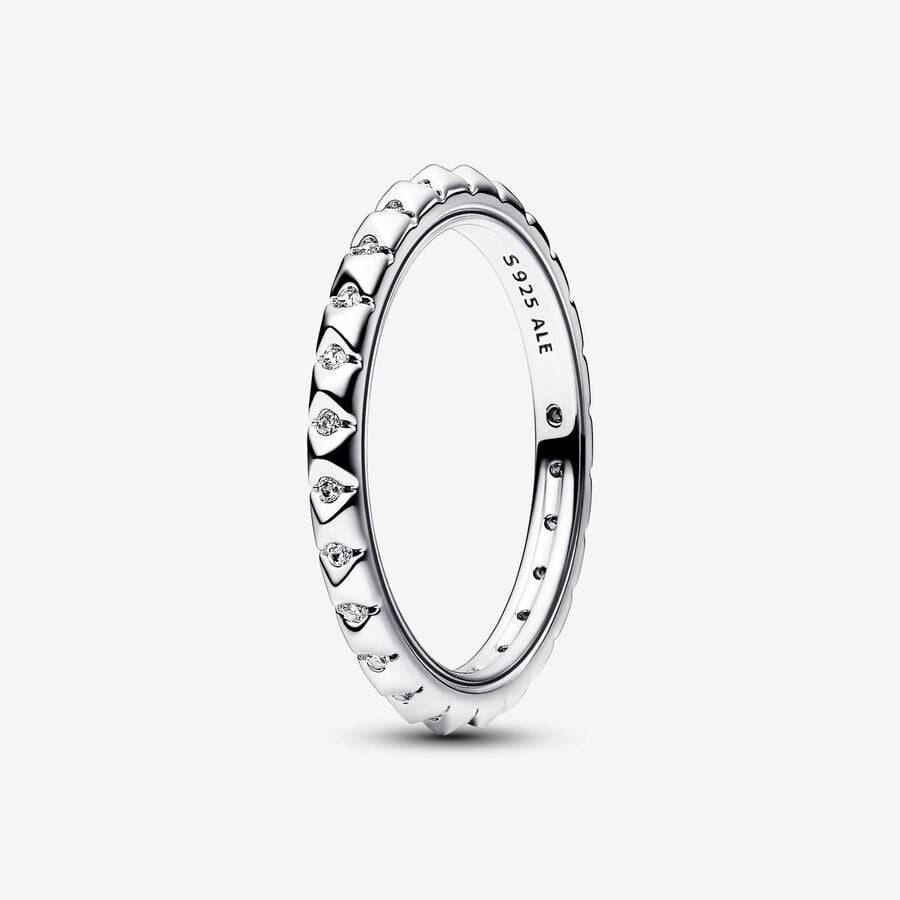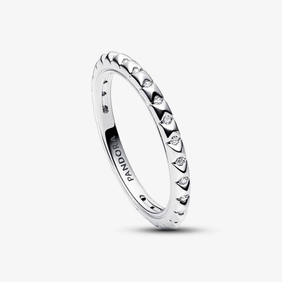 Create your own unique style with this Pandora ME Geometric Stone Ring. This sterling silver ring features a pyramid-shaped design embellished with clear cubic zirconia stones nestled between each pyramid. A grooved line runs the length of the ring on each side. Wear this piece alone to make it the centerpiece of your look, or create the perfect mix by mixing and matching different metal finishes.