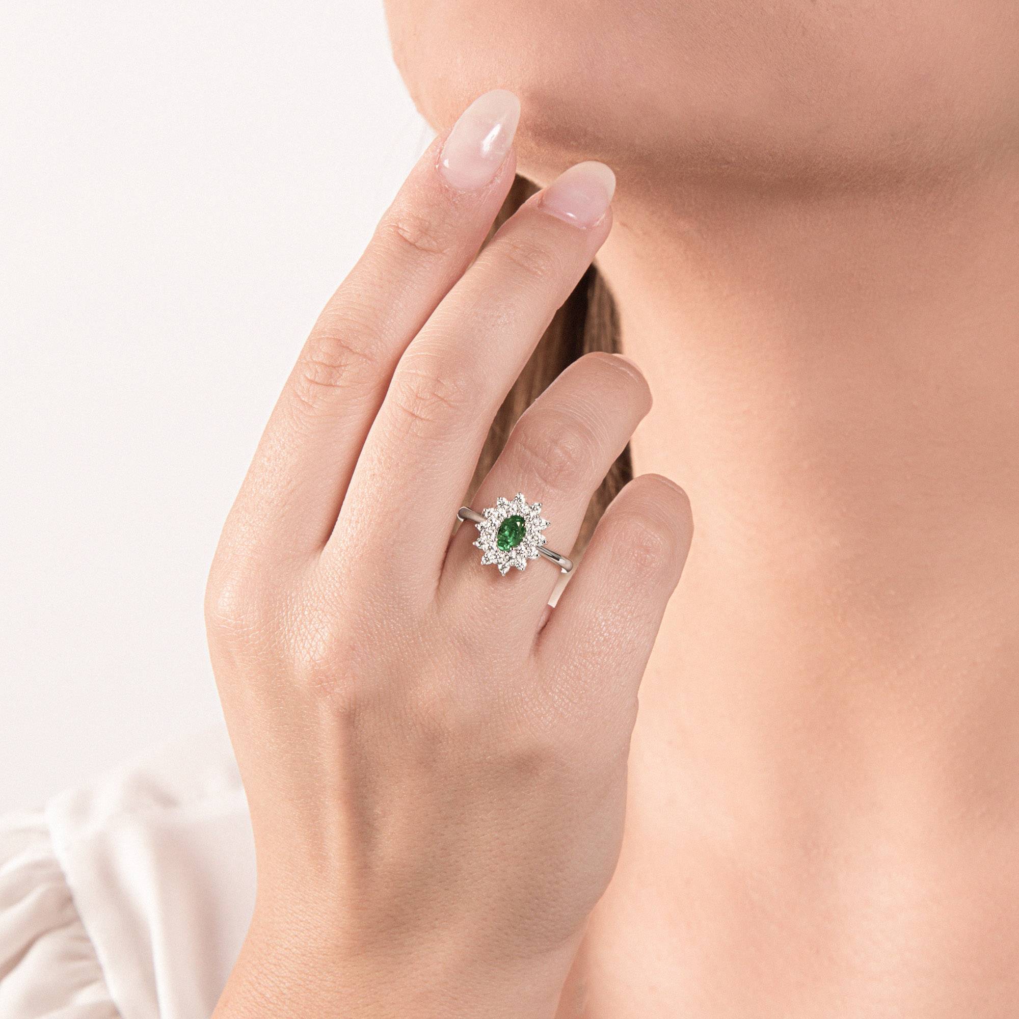 Rings featuring this stunning green stone are becoming must-haves for an ever-growing number of people. One example is the gold ring with an emerald and diamond centerpiece, beloved for its delicate shape and the exquisite center stone set in a refined setting. This elegant ring, by Mirco Visconti, is crafted from 18kt white gold and features a certified natural Colombian emerald surrounded by a double row of diamonds.