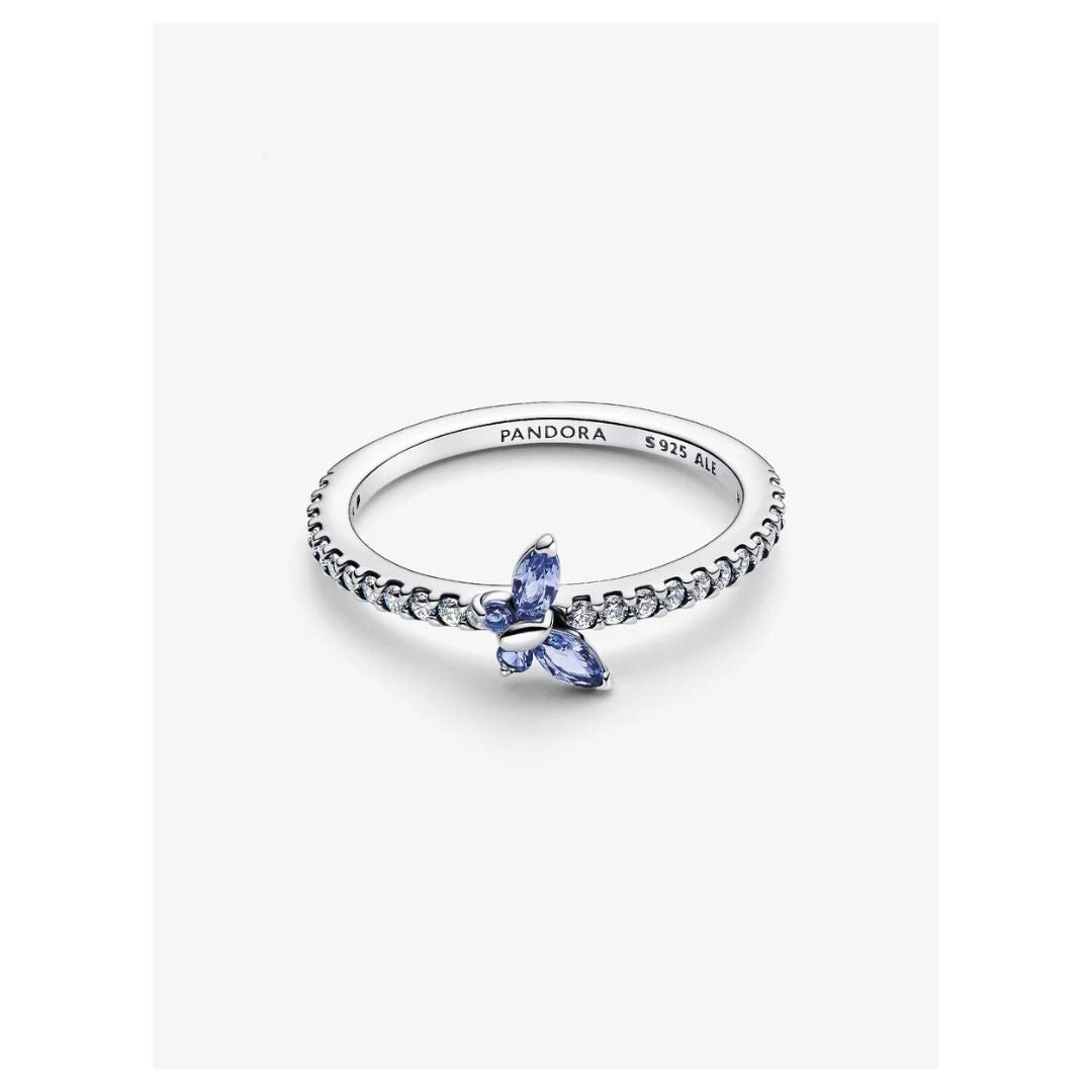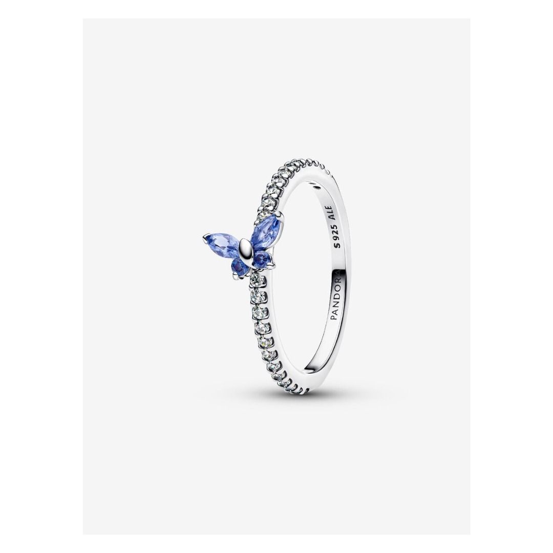 Add a subtle sparkle to your look. This 925 sterling silver ring features blue and colorless cubic zirconia and a slanted butterfly, symbolizing transformation and beauty.