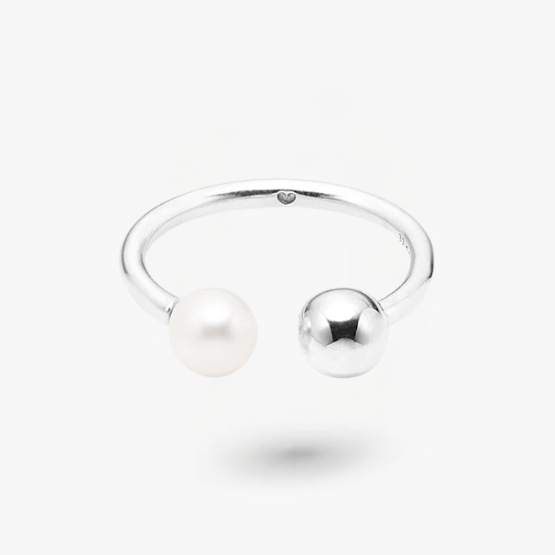 A 925 sterling silver sphere and a freshwater cultured pearl meet in an open ring, like a gaze toward the South and one toward the North. Crafted from 925 sterling silver and hand-finished, the piece presents and combines the pearl, always considered a classic stone, in a modern key and in a design so versatile it can be worn by women of all ages.