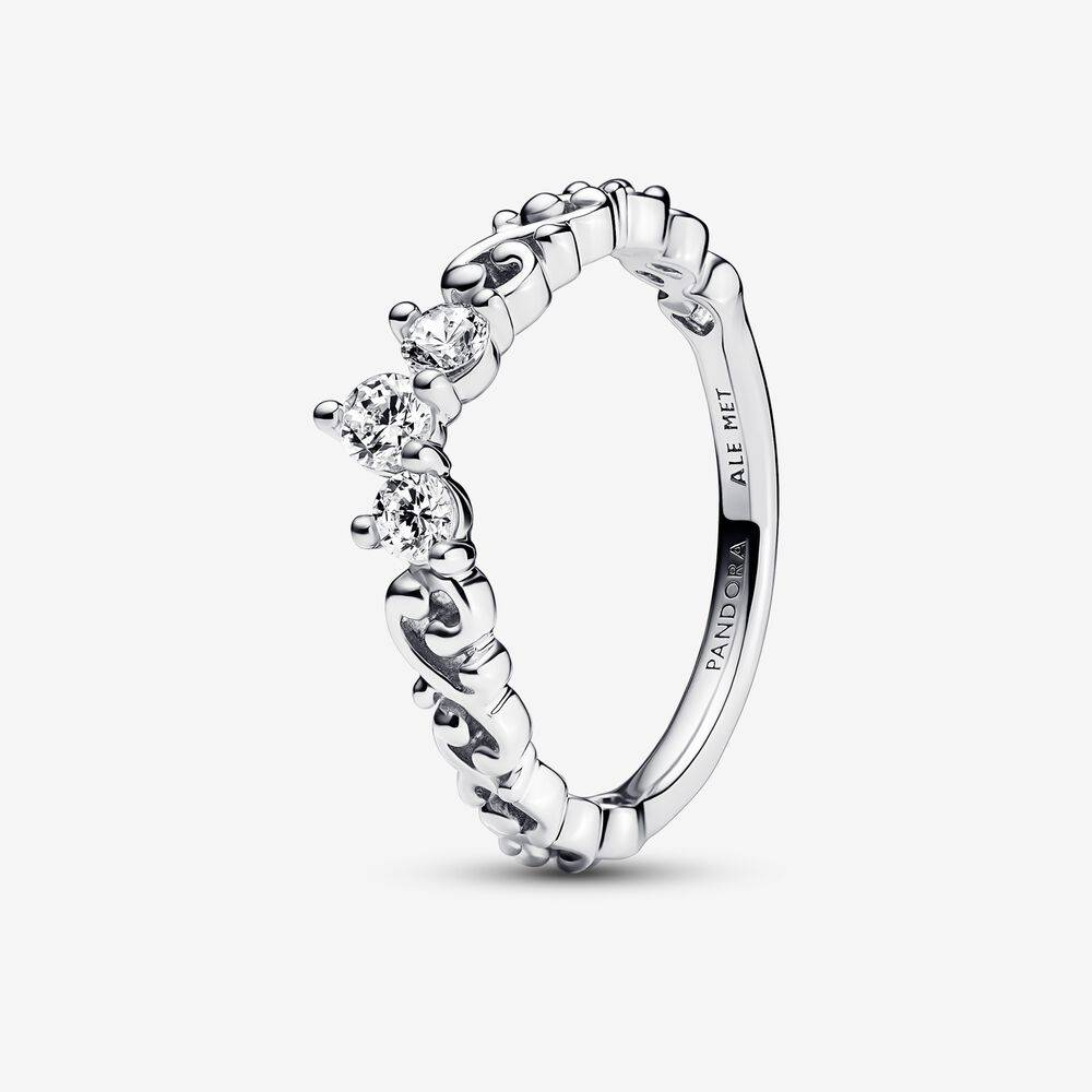 Add a touch of regal elegance to your look with our Royal Tiara and Spirals ring. Crafted from 925 sterling silver, this aristocratic piece features a tiara adorned with three sparkling stones and filigree details that create spiral lines. Crown your hand with this majestic ring and become a true queen.