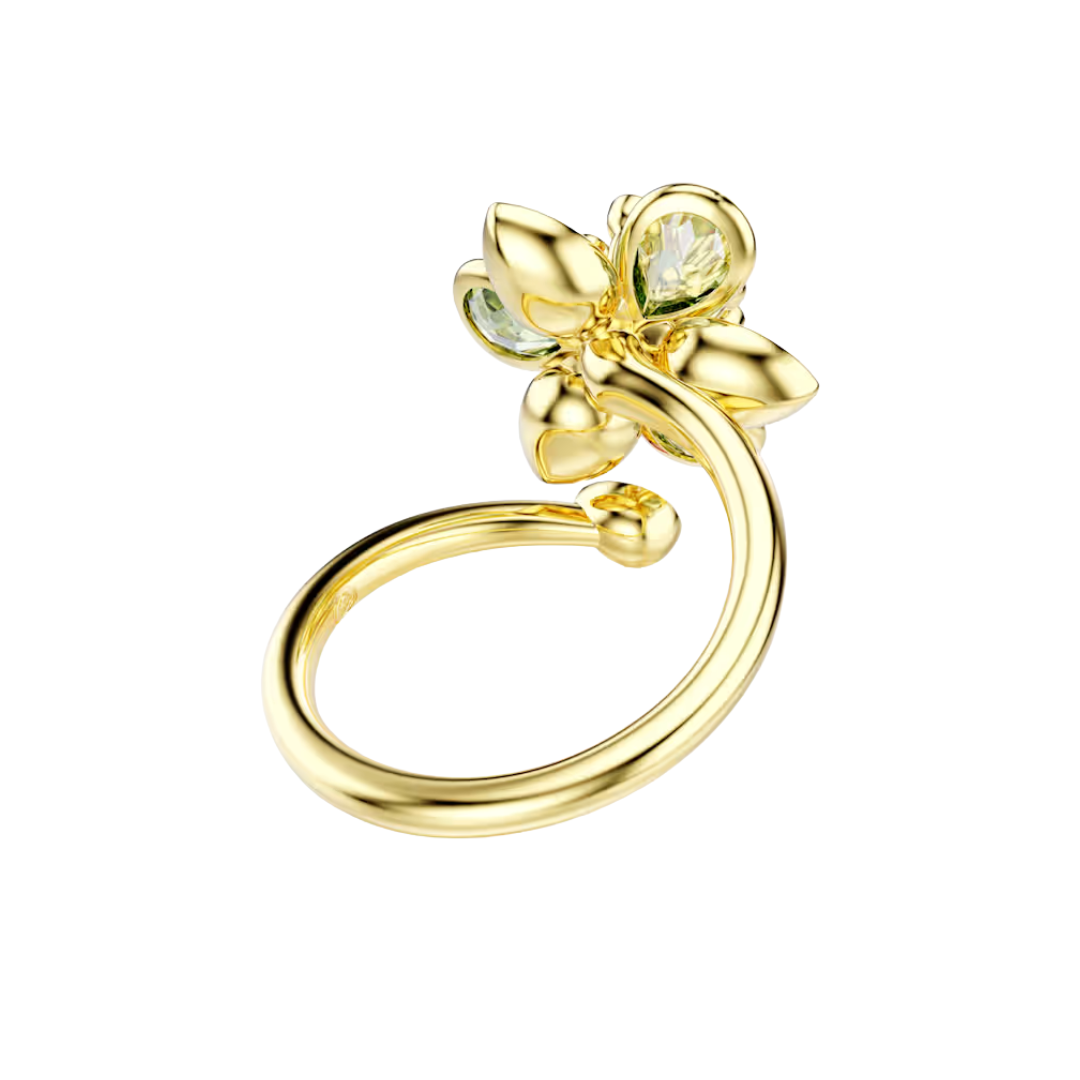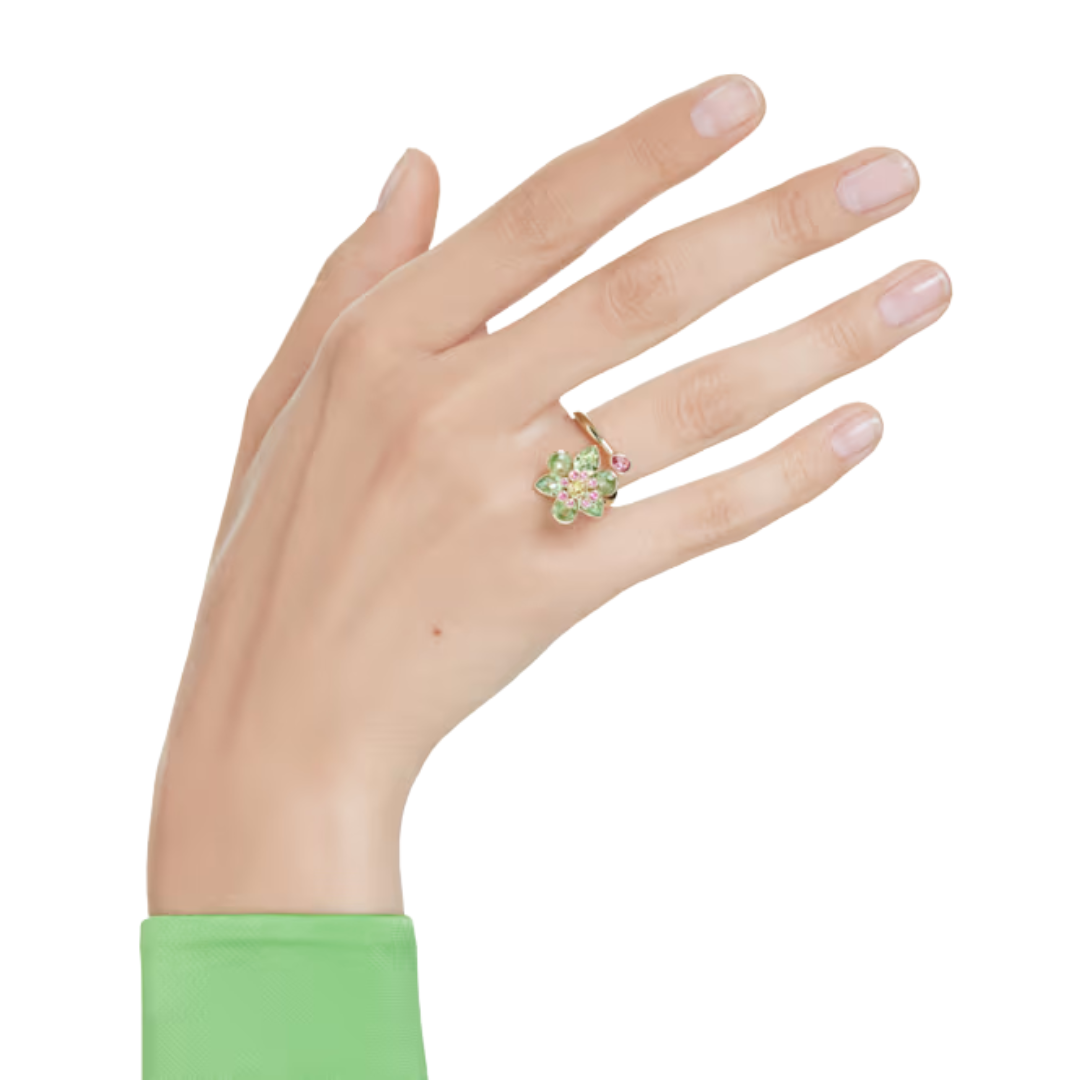 Elevate your nature-inspired style with this dazzling pattern ring. The gold-tone plated band spirals around the finger, culminating in a central flower crafted from green, pink, and yellow crystals. The varying shapes and hues capture the magic in every detail. Pair this ring with a matching Idyllia pendant for a look bursting with color and joy.
