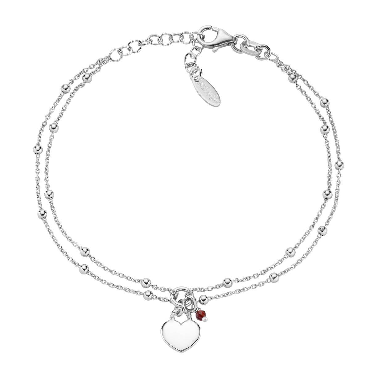 The bracelet features a double, luminous chain composed of micro spheres, adjustable up to 19 cm, from which hangs a small heart, with polished plating, accompanied by a red crystal that adds a touch of vivacity to the monochrome composition. Give this jewel to a special person because the heart has always been the bearer of a message of love.