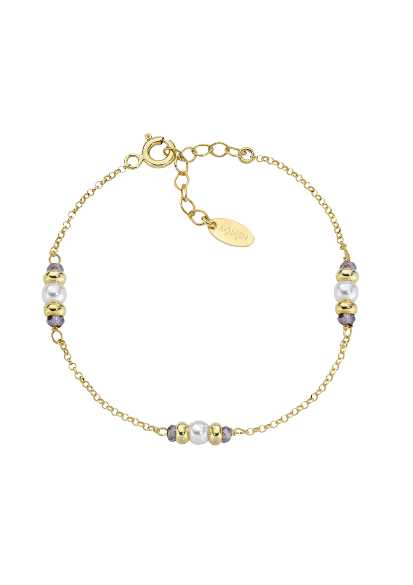 Women's bracelet in gold-plated silver with 4 mm white pearls and 2.50 mm purple crystals. Size 16 + 3 cm.