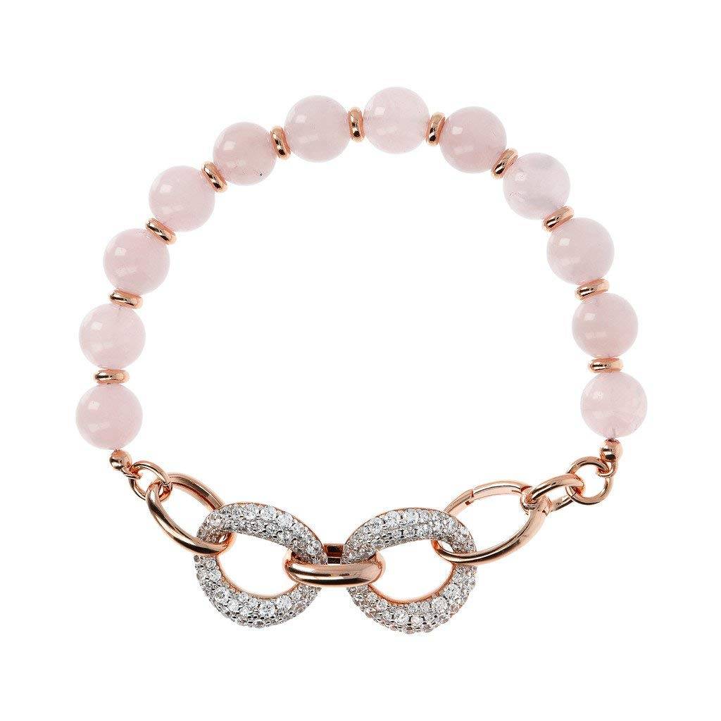 A bracelet featuring rose quartz, Golden Rose nuggets, and a hidden clasp with cubic zirconia. The finest natural stones are paired with the warm tones of rose gold plating for a statement and classy bracelet that will last season after season.