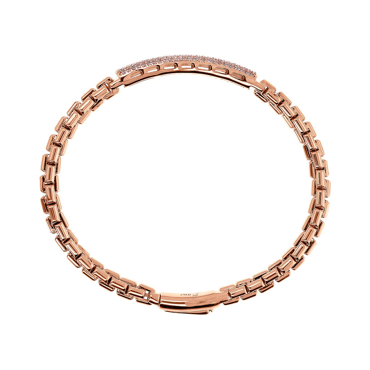 Bronzallure semi-rigid bracelet made of Golden Rosé alloy, plated in 18kt rose gold, with Venetian link and a central plate paved with luminous cubic zirconia. Box clasp. External diameter: 63 mm.
