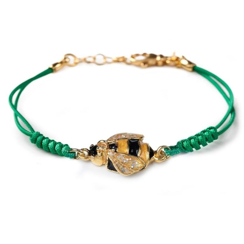 Il bracciale Isola Bella è composto esclusivamente da argento dorato 925% e cordoncino in cotone cerato verde, impreziosito da un'ape in argento placcato oro giallo e smaltato giallo e nero.