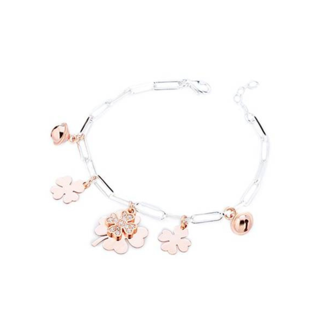 925 silver bracelet with four-leaf clovers with zirconia and pink bell pendants from the Petite Boules collection.