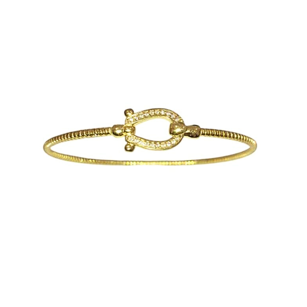 Rigid bracelet from the Twist collection by Marcello Pane in 925 silver plated with 18 kt yellow gold with white zirconia on the clasp.