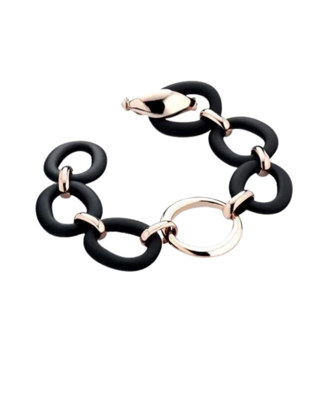 Bracciale con elementi in argento con finitura soft touch, tipica della collezione Rubber, ed elemento centrale e chiusura in argento rosè 925. Il bracciale è lungo cm 20 e ha una vestibilità confortevole e leggera, grazie alla lavorazione in elettroformatura.