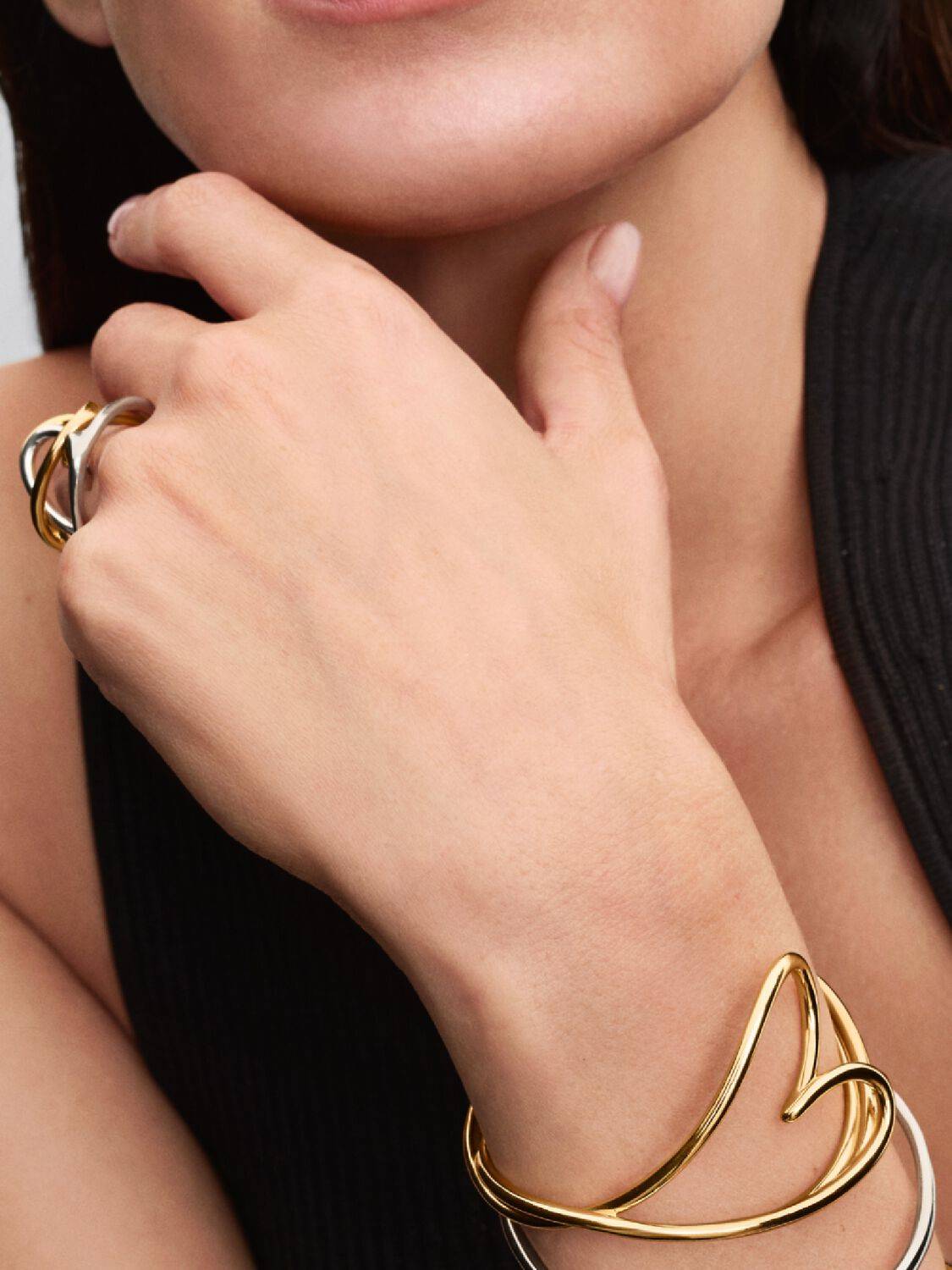Love meets the sinuous lines of nature in this sculptural jewel. A continuous line wraps around the wrist, forming an open bangle with an oversized heart motif. Pair it with the matching earrings and ring for a modern reinterpretation of a classic symbol of love.