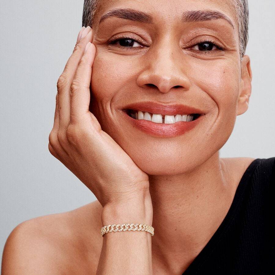 Light up your look with this Pavé Cuban Chain Bracelet from the Timeless collection. This 14k gold-plated bracelet features a chain paved with clear cubic zirconia stones. Each semi-circle link is decorated with three round stones, while the back of the chain is polished for comfortable wear. The bracelet closes with a flat clasp engraved with the Pandora logo. Wear this luminous bracelet or gift it to a loved one to express your love.