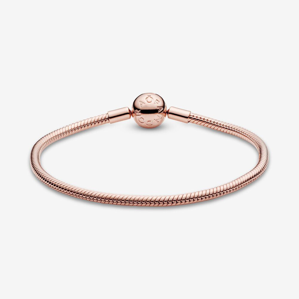 Start your Pandora story with this refined snake chain bracelet in 14k rose gold plating. Hand-finished, it can be reworked in countless ways, unleashing your creativity. Wear it with your favorite charms and clips, alone for a simple and understated look, or layer it with other contrasting bracelets for a playful play on textures—the only limit is your imagination.