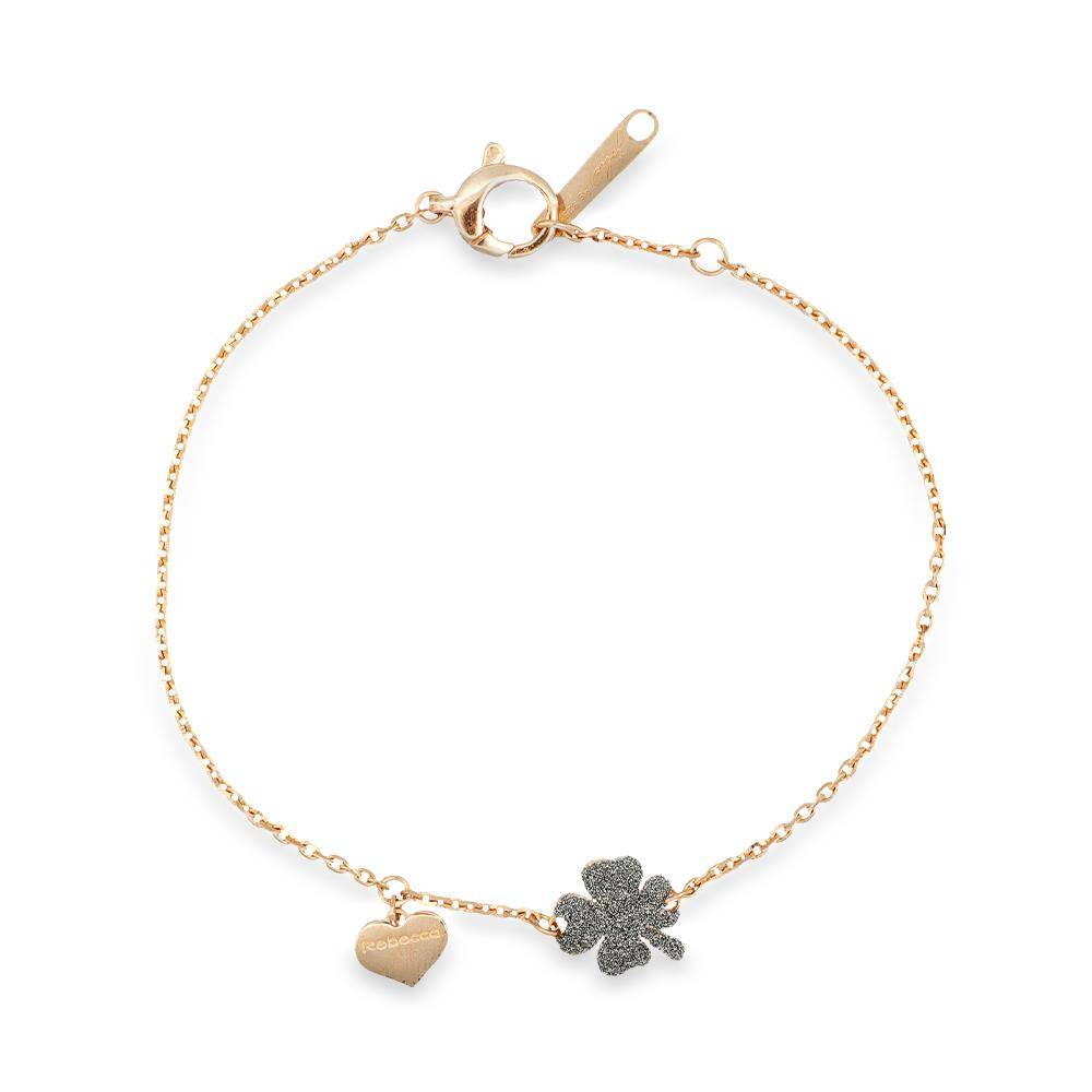 Rebecca bracelet in 925 rose silver with a diamond-dusted four-leaf clover. Lobster clasp closure. Length: approximately 16 cm.