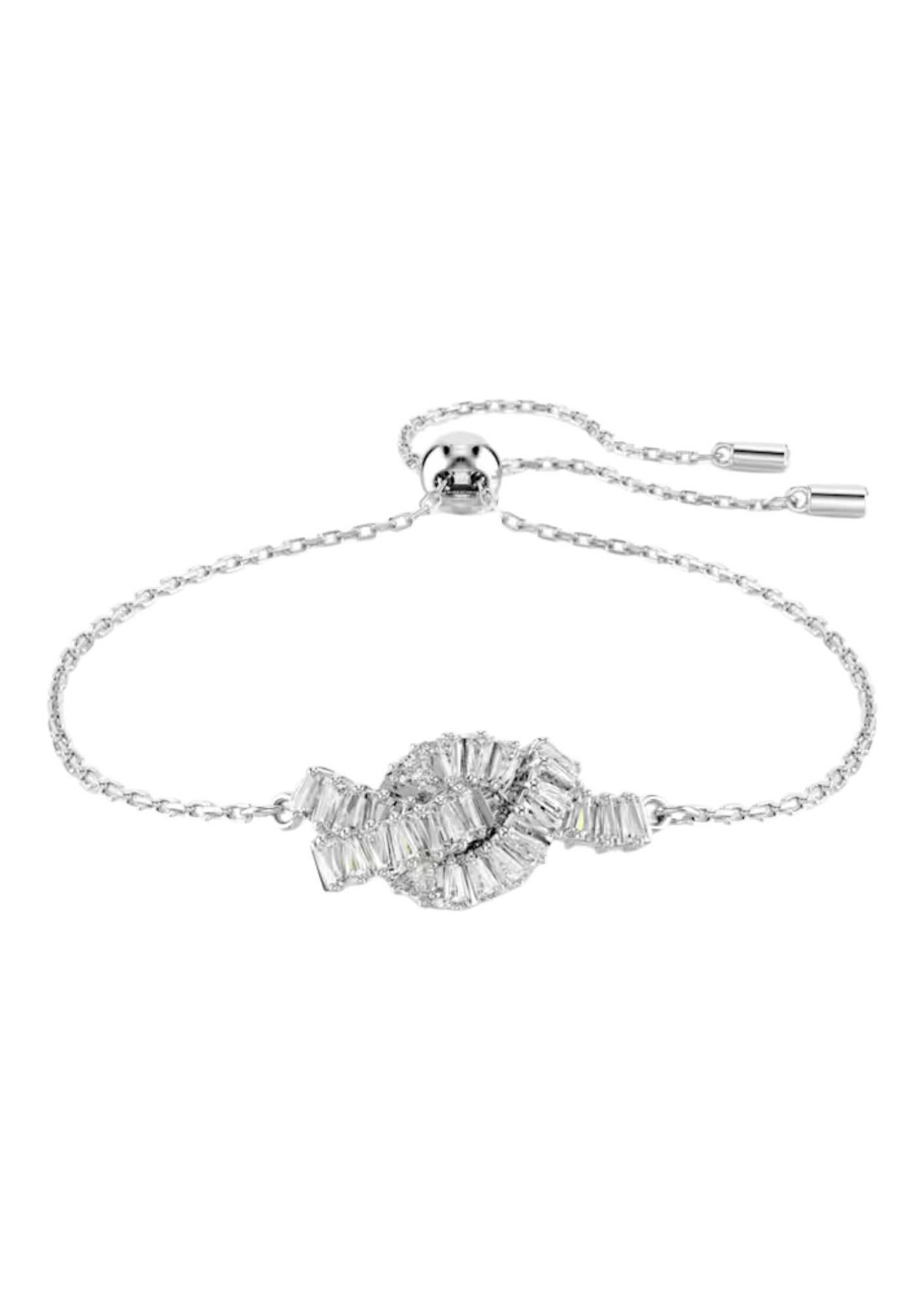 This braided bracelet is a pure expression of light and unity. Featuring an adjustable sliding chain, the rhodium-plated motif is inspired by a ribbon and features intertwined baguette-cut Swarovski zirconia. Delicate and elegant, it's an artistic choice to wear with matching pieces from the same family.