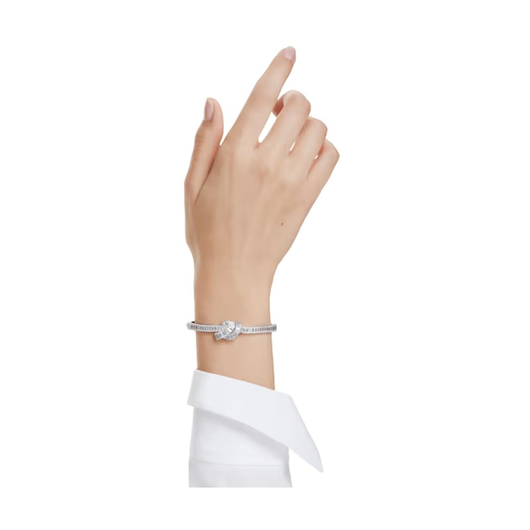 Questo bangle Swarovski è ingegnosamente intrecciato in un suggestivo groviglio di luce. Il design ispirato a un nastro è placcato rodio e presenta una sofisticata decorazione di Swarovski Zirconia taglio Baguette, ciascuna con montatura a griffe. Questo bangle artistico è una radiosa creazione statement per il polso e può essere abbinato ad altri gioielli coordinati per un look completo. Lunghezza 16 cm.