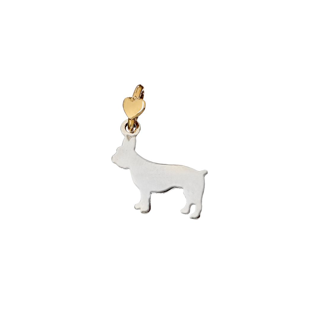 Dog pendant from the DOGS collection: our canine friends from the magical world of nature. French Bulldog motif. Available in 925°/°° silver with a 9kt yellow gold heart clasp.