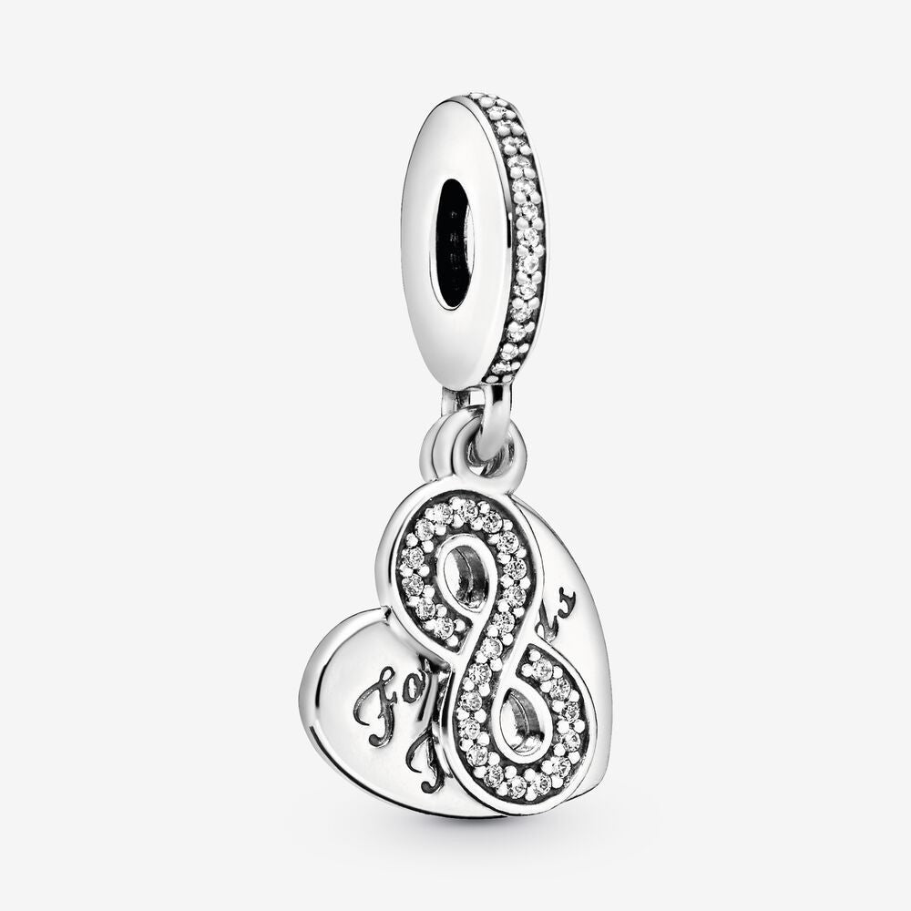 Wear or give this friendship-inspired charm as a gift to show that friends are forever, just like the engraving says. Crafted from sterling silver, it features two pendants: a heart and an infinity symbol, encrusted with sparkling stones that add extra sparkle to any look. Designed for our Pandora Moments bracelets, it also looks great strung on a necklace as a pendant.