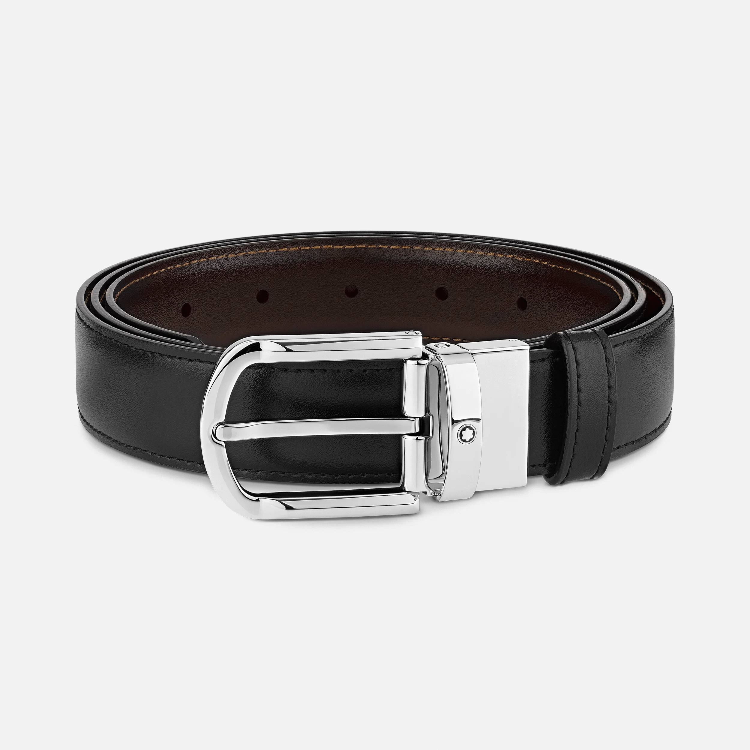 Rounded horseshoe revolving pin buckle with shiny palladium finish and Montblanc emblem. Reversible black and brown leather strap, 3 cm x 120 cm adjustable.