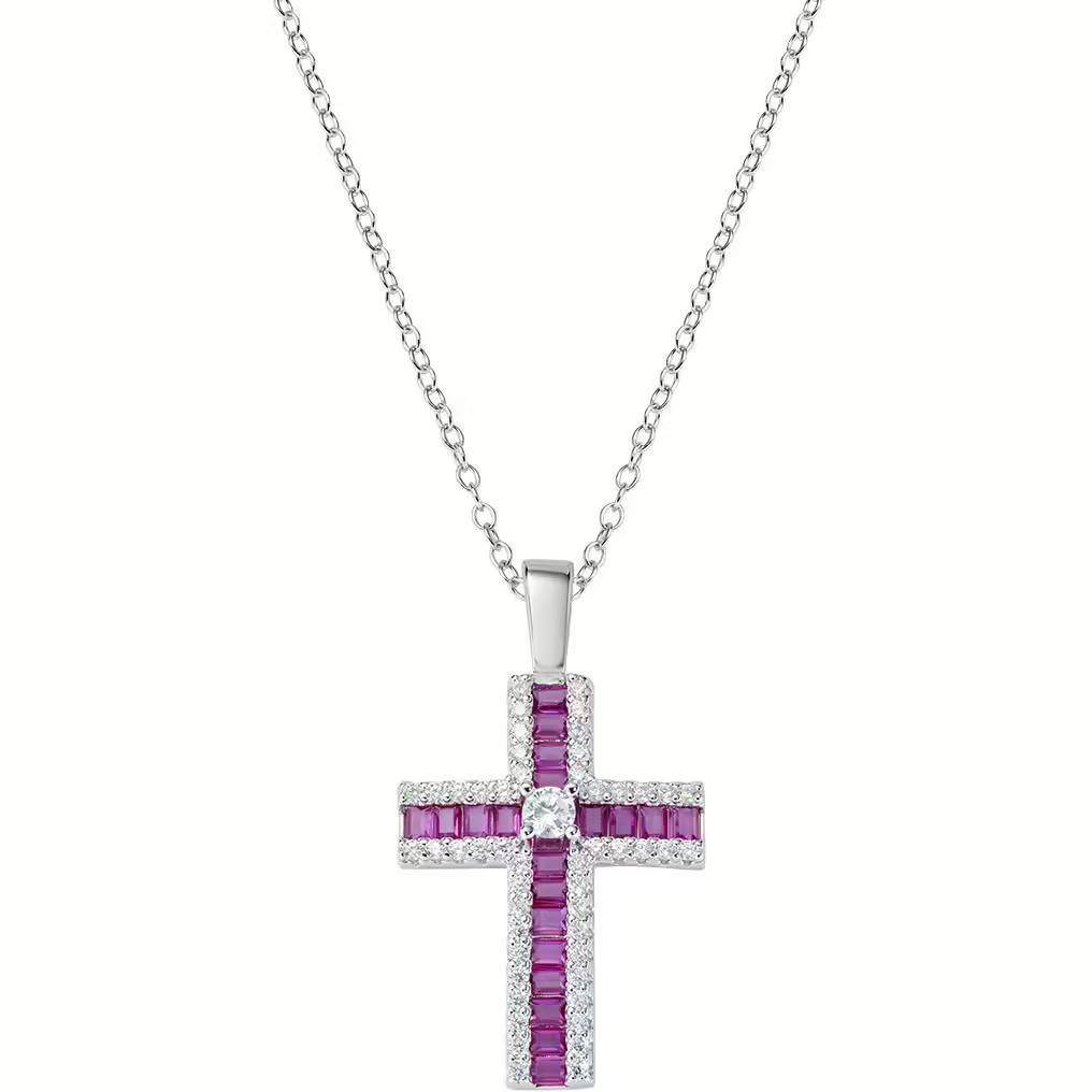 Rhodium-plated 925 silver necklace with a cross pendant and red and white zirconia. The chain length is adjustable from 40 to 45 cm with an extension chain and lobster clasp. The cross is 2 cm long and features baguette-cut red zirconia surrounded by a pavé of white zirconia. A 2 mm zirconia is centered.