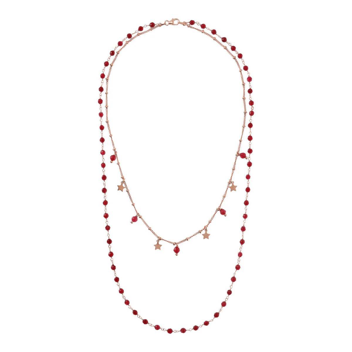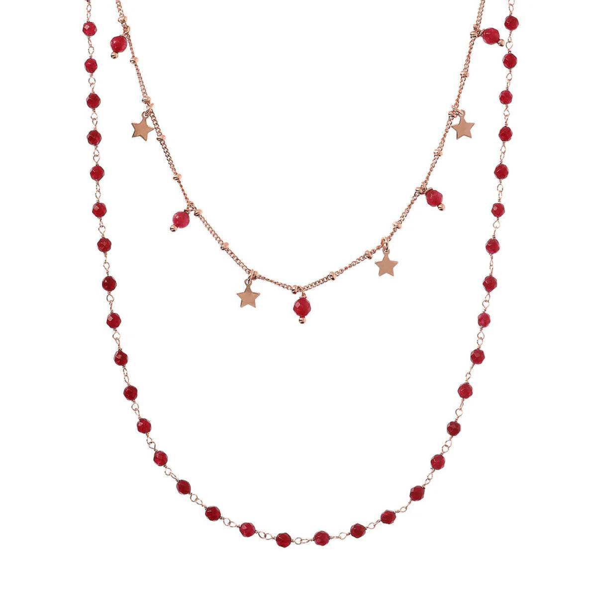The double-strand necklace with natural stone spheres and stars by Bronzallure is the perfect piece to complete any outfit and turn heads. Original and playful, this 18-karat rose gold-plated Golden Rose jewelry piece is available in red agate, black spinel, or blue quartz. Pair the necklace with matching rings and earrings or other creations from the Variegata collection.