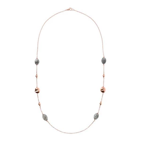 Bronzallure long necklace made of Golden Rosé alloy, plated in 18kt rose gold with rolo chain embellished with stations of irregular nuggets (17x15 mm), smooth spheres (7 mm) and oval grey quartz natural stones (13x18 mm); lobster clasp closure.