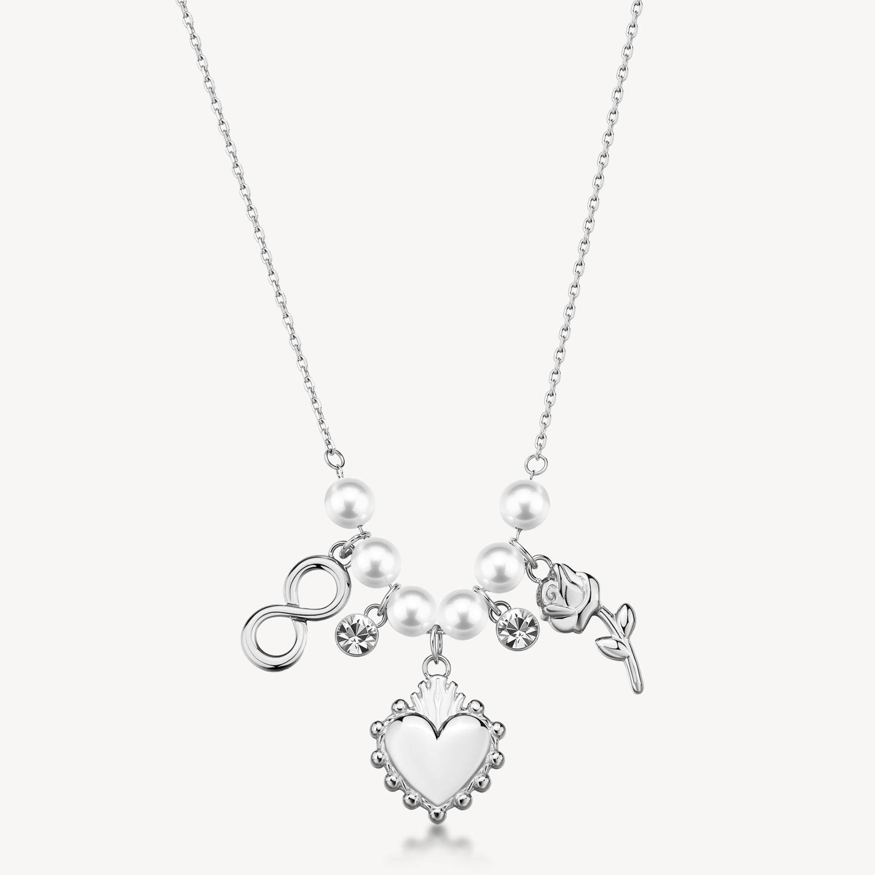 316L steel choker necklace with heart, rose, and infinity pendants, set with crystals and shell pearls.