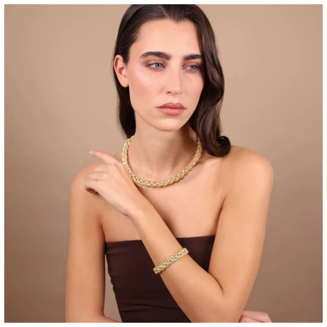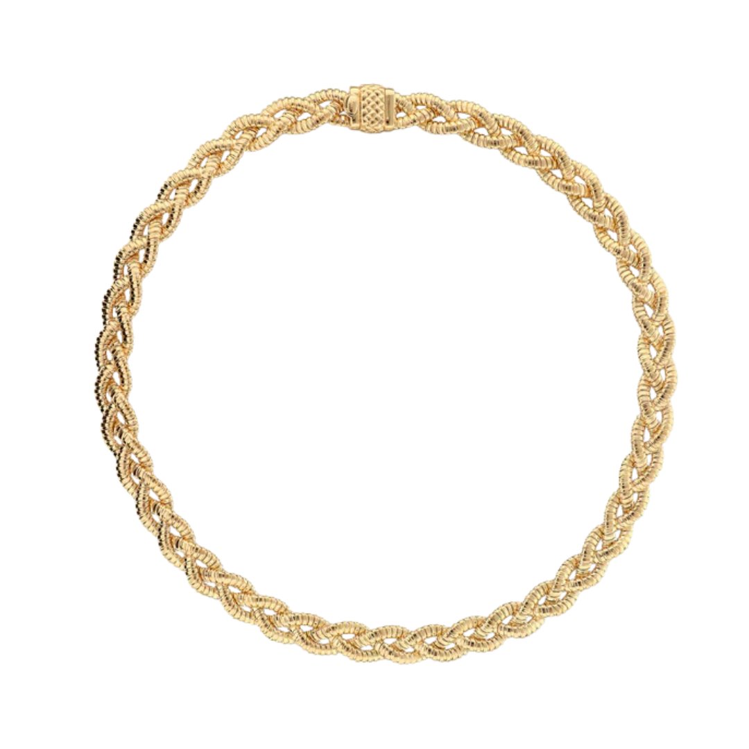 Etruscan necklace in gold-plated alloy, plated in 18kt yellow gold, with braided tubogas link. Length: 44.5 cm. Magnetic closure.