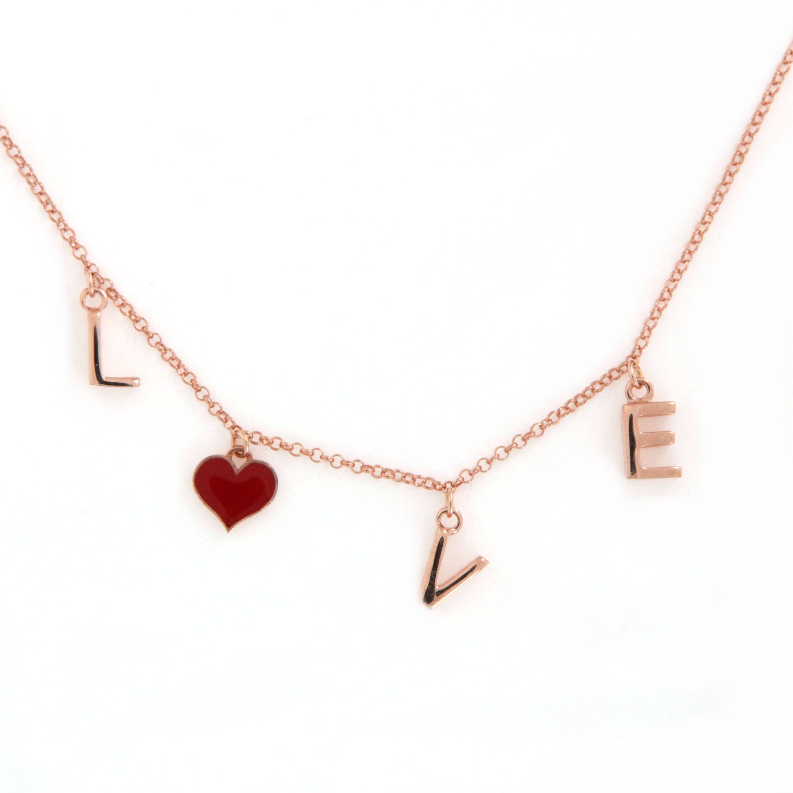 Versari necklace with smooth "Love" lettering in 925 rose gold silver and a red enamel heart. Length: 38.5 cm + 5 cm adjustable extension.