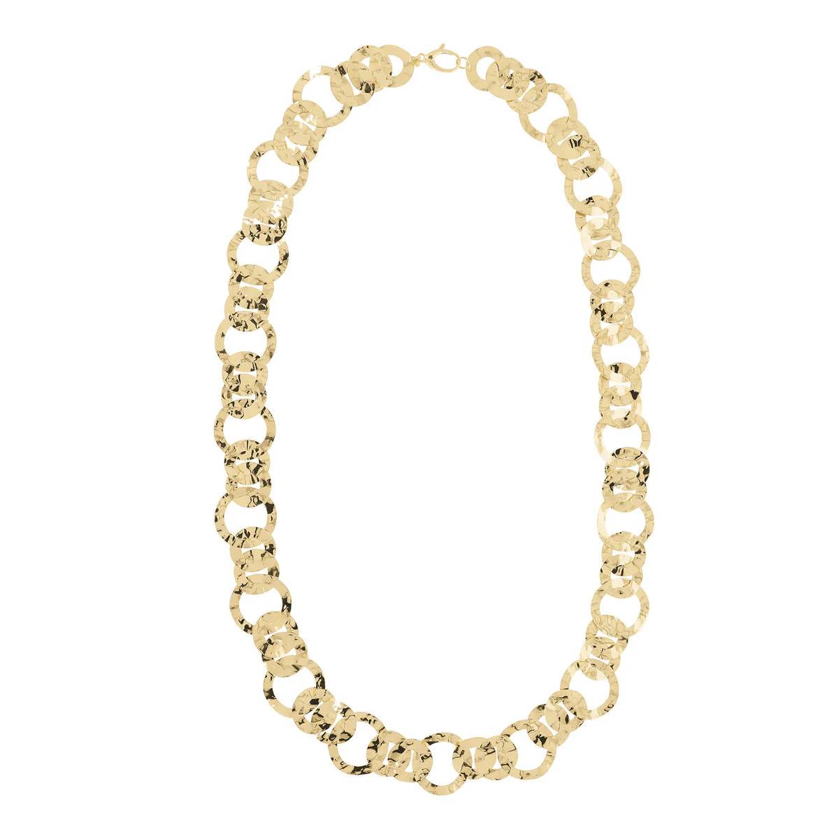 Etrusca Gioielli necklace mounted on a Golden base, plated in 18kt yellow gold, embellished with a figaro chain composed of flat link links with a hammered finish; lobster clasp closure, length 81cm. This unique piece pairs well with the wide range of jewelry from the Mirage collection, which combines modern design with a hammered finish and timeless charm.