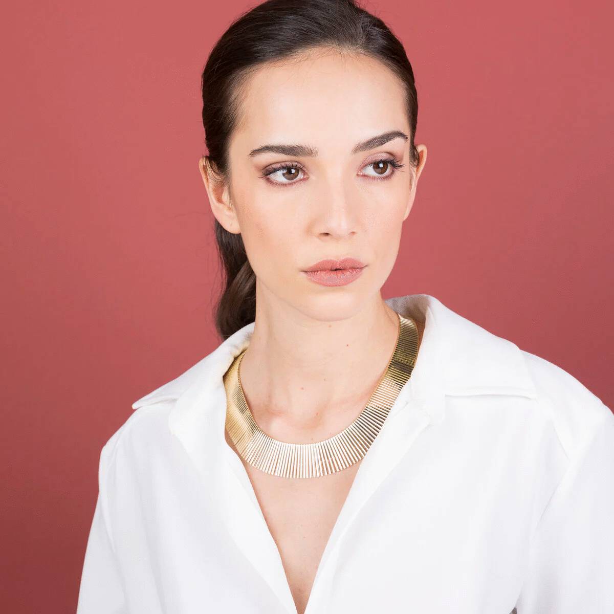 Cleopatra Etrusca Gioielli necklace mounted on a Golden base, plated in 18kt yellow gold, featuring a graduated design with a hammered surface; lobster clasp closure. This unique creation pairs well with the wide range of jewelry from the Mirage collection, which combines modern design with a hammered finish and timeless charm.