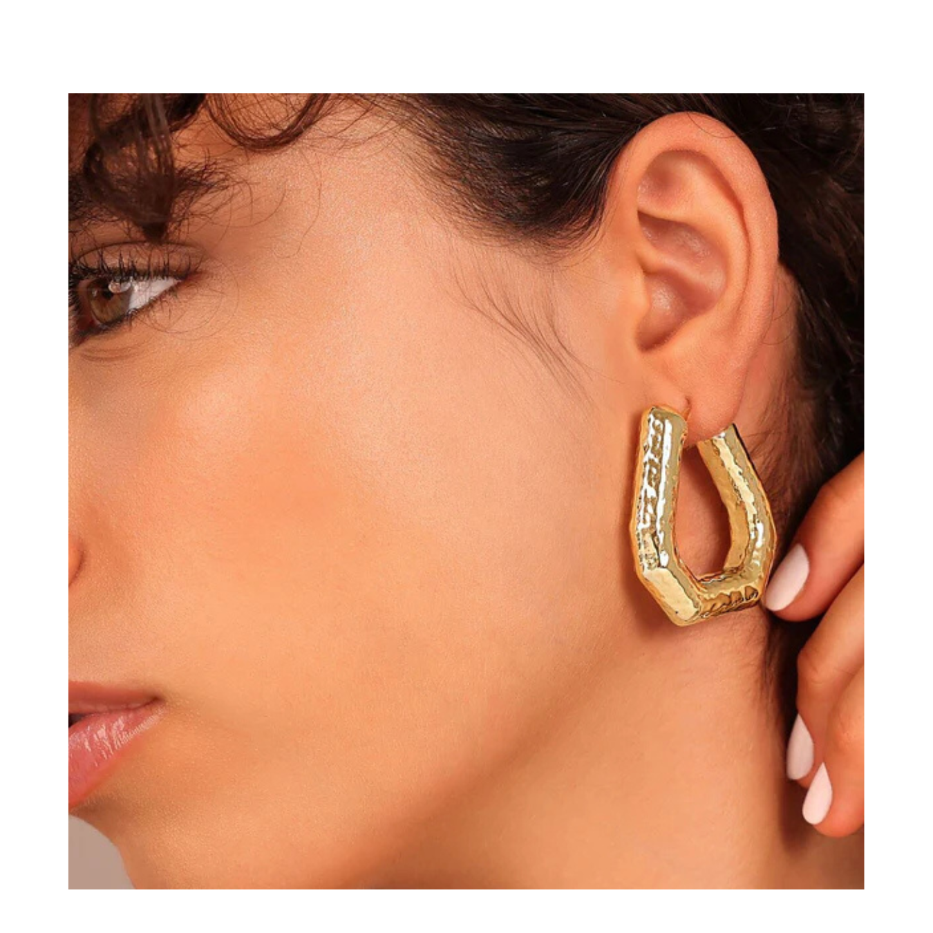 Etrusca Gioielli hoop earrings made of Golden alloy, plated in 18kt yellow gold, with a geometric design and a hammered surface. Dimensions: 40x35 mm. Bayonet closure.