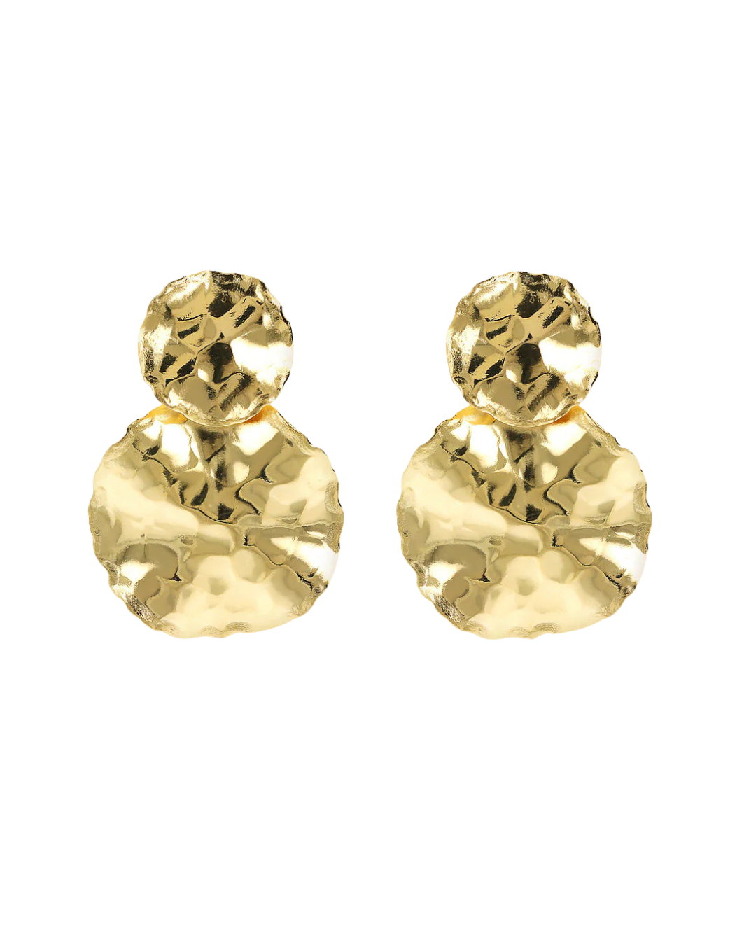 Etrusca Gioielli drop earrings made of Golden alloy, plated with 18kt yellow gold, with two graduated discs (17-28 mm) and a hammered surface. Length: 4 cm. Pin and butterfly closure.