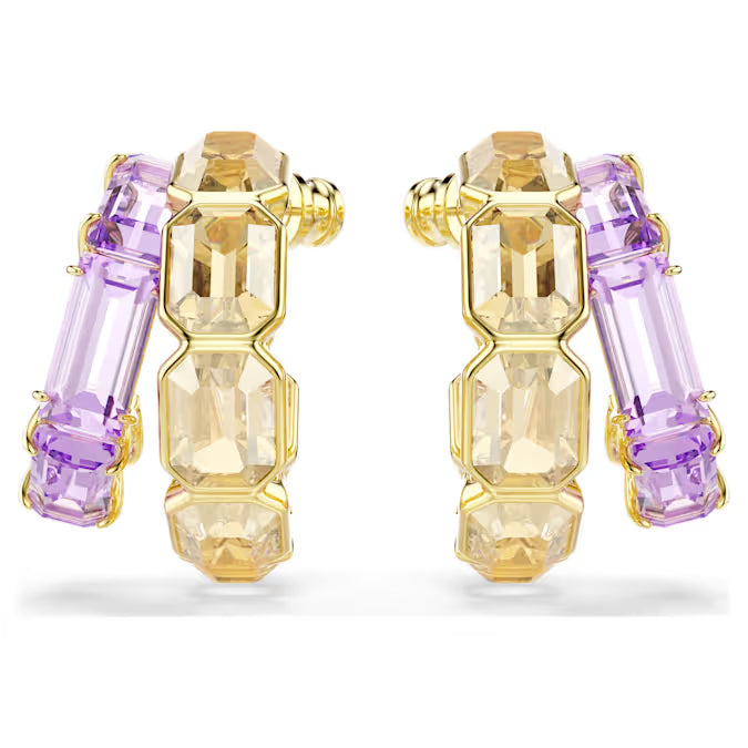 These multicolored earrings are the perfect choice for absolute glamour. Each gold-tone plated earring features two asymmetrical mini hoops, with octagonal caramel crystals in a bezel setting and purple crystals in a prong setting. A stunning mix of contrasts that blend together for a bold look. Wear these earrings with coordinating pieces from the same family to accentuate the effect.
