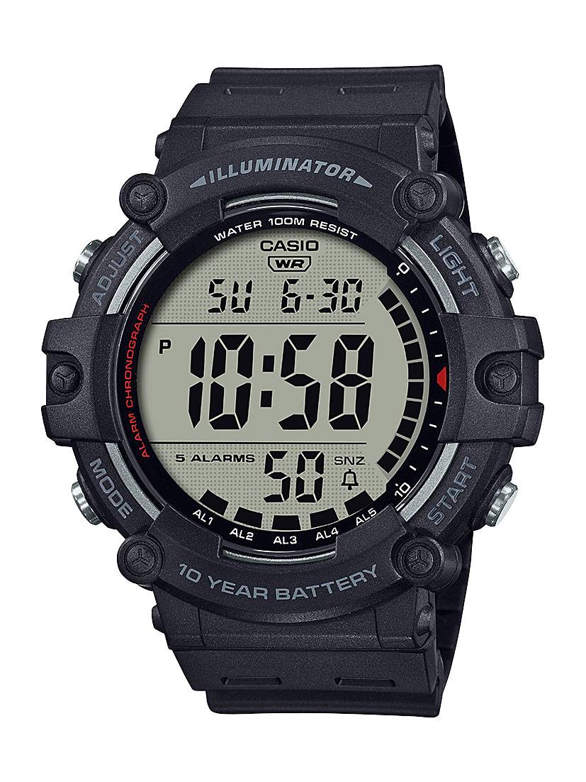 • 10-year battery life • Hundredths of a second stopwatch • Second time zone time • 5 audible reminders • Water resistant to 100 meters • LED backlight • Large dial