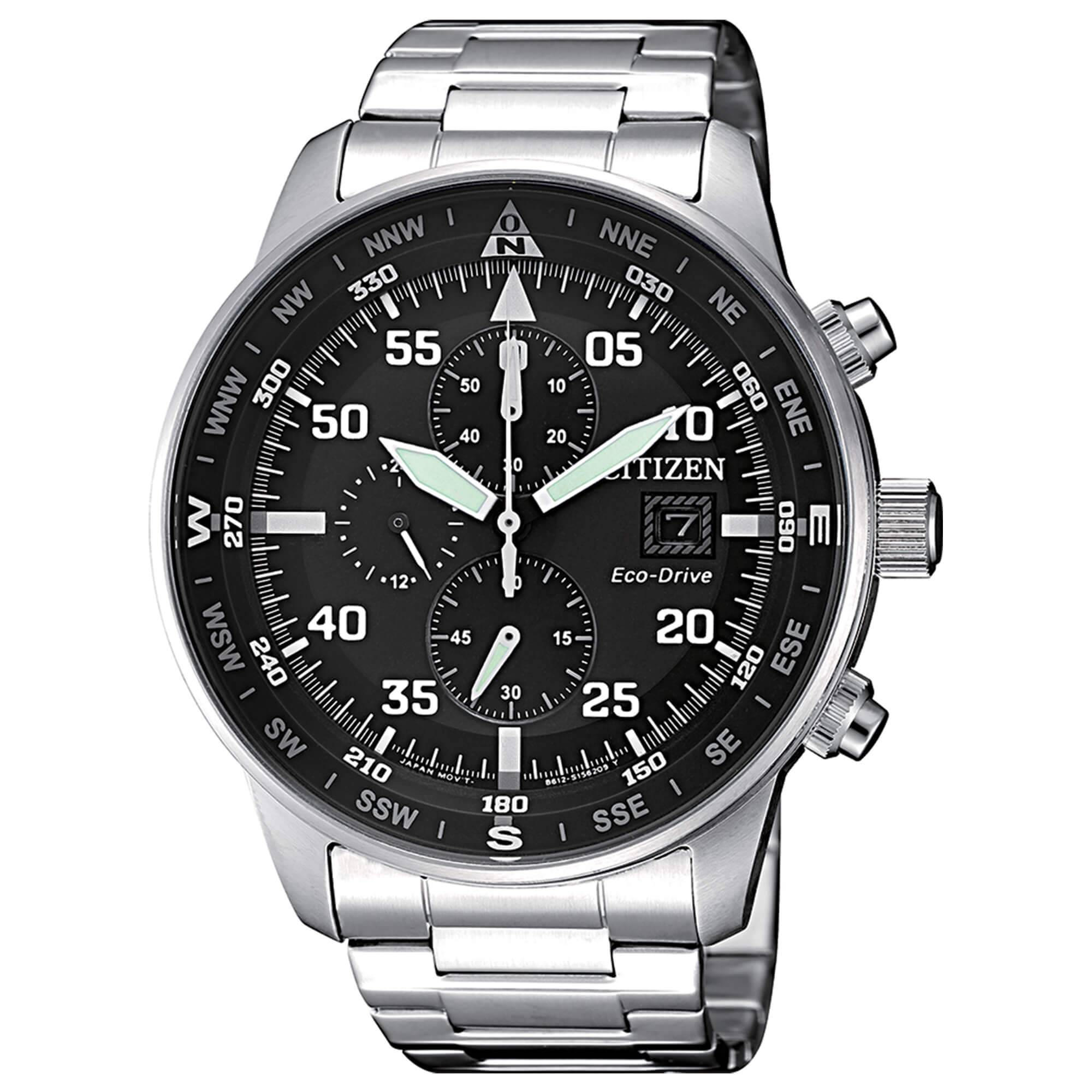 Movement: Eco Drive, solar-powered, with a 270-day power reserve. Functions: Chronograph with 1/5th of a second, up to 60 minutes. Steel case and bracelet with screw-down caseback. Water resistance: 10 bar. Case diameter: 44 mm.