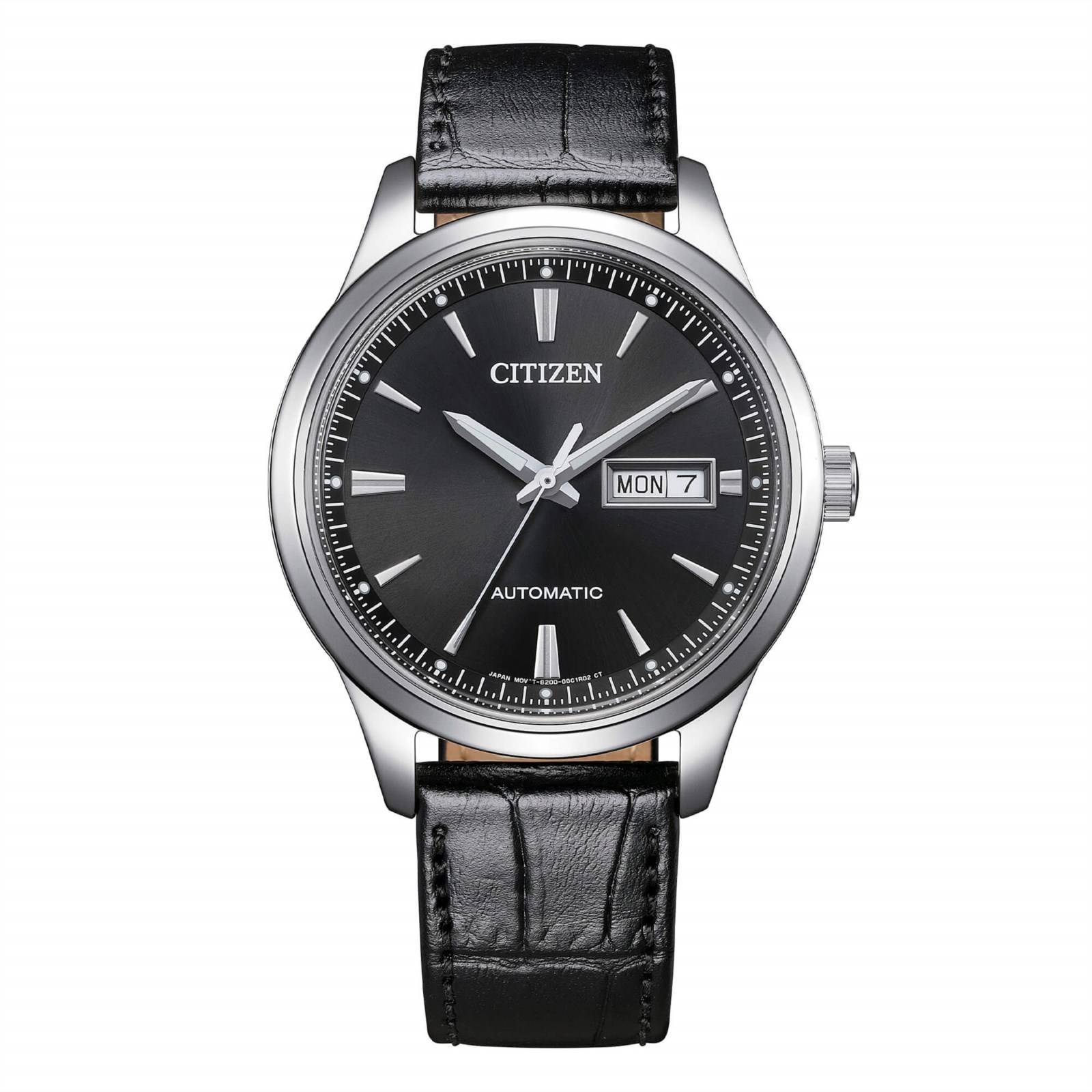 Citizen men's watch, NY4058-01E, classic collection, automatic movement, time only, 40mm steel case, black dial with date display, leather strap, 5atm water resistance.