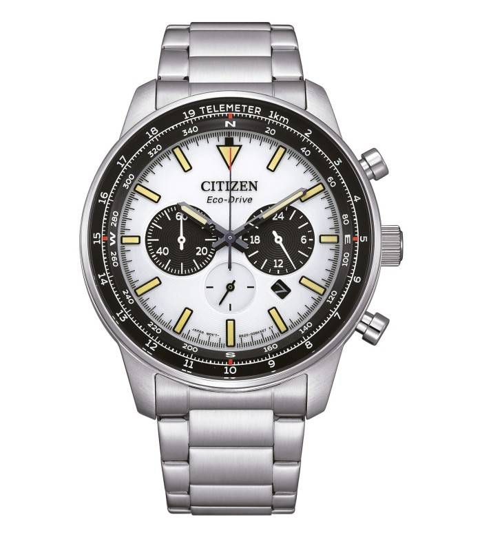 Citizen Chrono Aviation CA4500-91A watch, model with Eco Drive caliber B620 movement with 270-day power reserve, chronograph and date. 44 mm steel case, screw-down caseback. Mineral crystal. Blue dial with luminescent indexes and hands. Date display at 4/5 o'clock. Steel bracelet with push-button safety clasp. WR 10 bar.