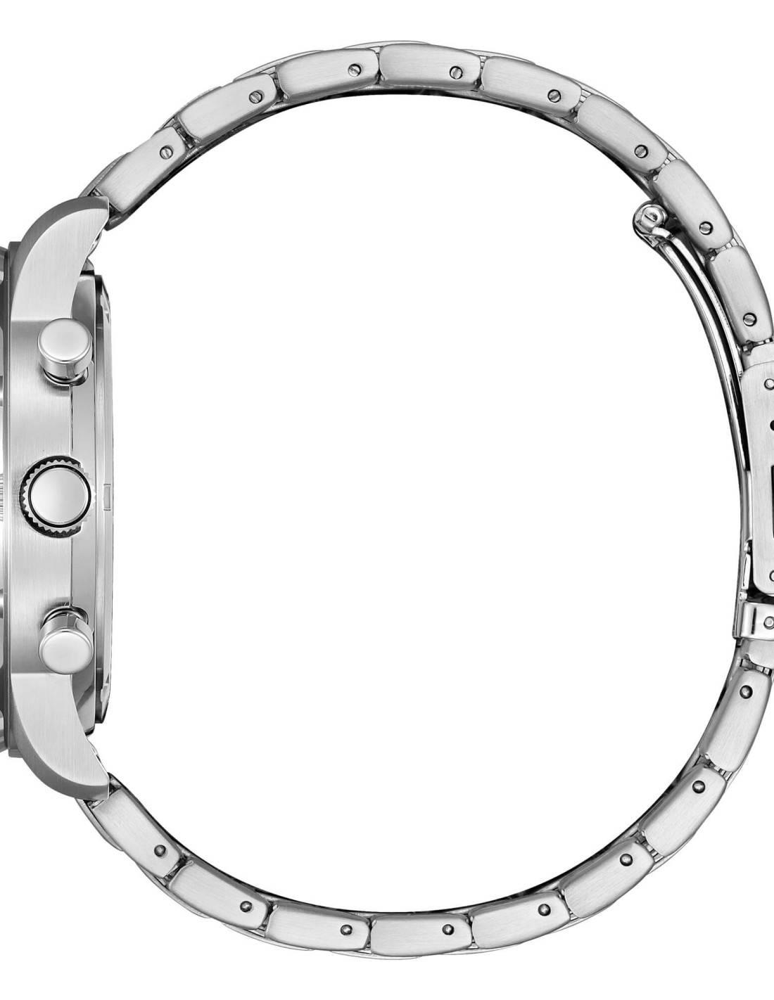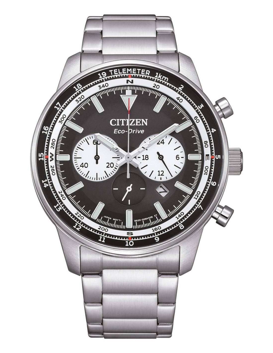 Citizen CA4590-81E classic chronograph watch with black dial and steel bracelet, case diameter 41 mm. and thickness 12 mm. Eco Drive solar movement caliber B620, water resistant 10 bar.