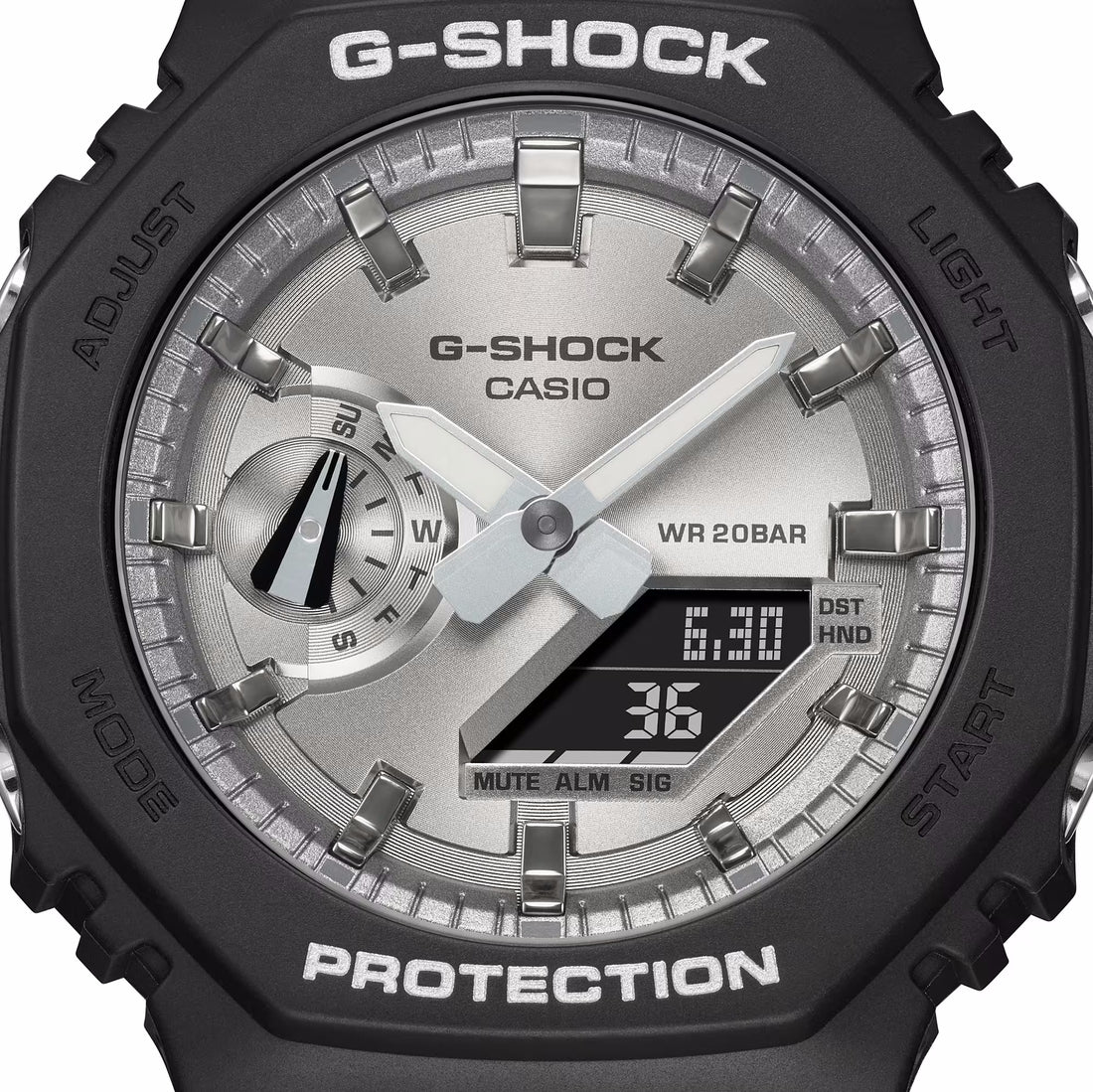 Joining the GA-2100 series are two G-SHOCK models that combine the octagonal design, with a resin case and strap, with a metallic-looking dial, achieved through IP silver and gold coating. Two models are more compact than other analog-digital G-SHOCK models, measuring just 11.8 mm from bezel to caseback. This slim, bold design maintains the G-SHOCK's durable construction.