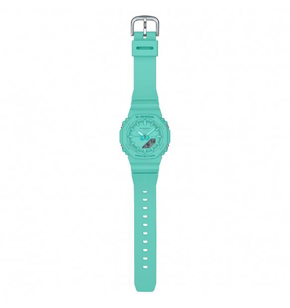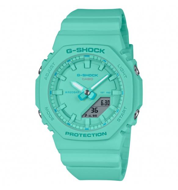 Discover the GMA-P2100 model from the Tone-on-Tone series, even more compact and smaller in size than the GMA-S2100 series to fit even smaller wrists. The model is available in bright colors, such as turquoise, pink and white, while the recessed dial at 9 o'clock of the original GMA-S2100 is abandoned for a clean, minimalist look. The design of the watch is composed of components finished in different shades of the same color, while providing good readability. The bezel and strap of these watches are made from biobased resin produced from renewable organic resources, a material that helps contain CO2 emissions and reduce environmental impact.