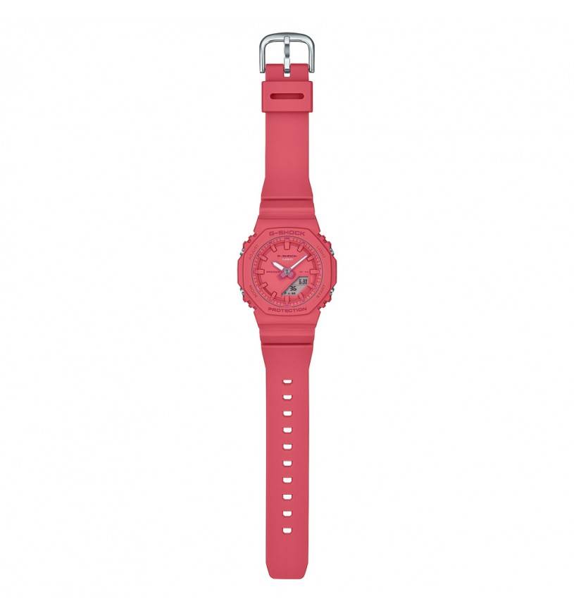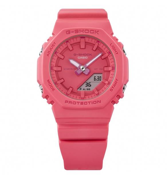 Discover the GMA-P2100 model from the Tone-on-Tone series, even more compact and smaller in size than the GMA-S2100 series to fit even smaller wrists. The model is available in bright colors, such as turquoise, pink and white, while the recessed dial at 9 o'clock of the original GMA-S2100 is abandoned for a clean, minimalist look. The design of the watch is composed of components finished in different shades of the same color, while providing good readability. The bezel and strap of these watches are made from biobased resin produced from renewable organic resources, a material that helps contain CO2 emissions and reduce environmental impact.