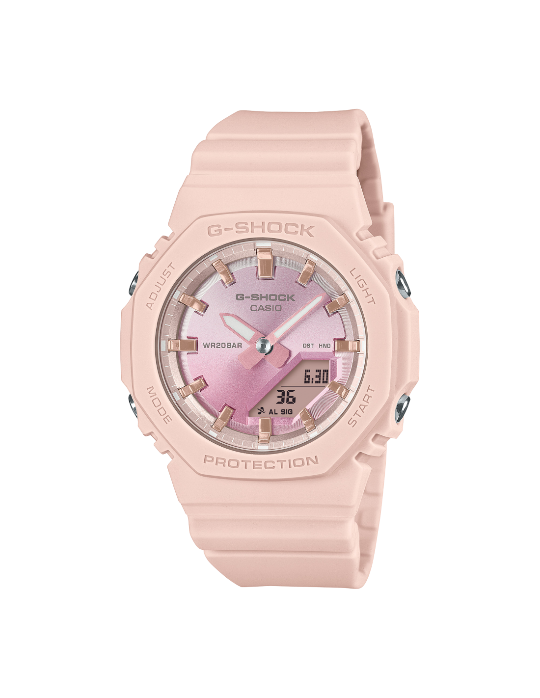 Immerse yourself in the splendor of a watch inspired by stunning summer sunsets. The shimmer of the sun setting over the water at the end of a beautiful summer day is captured using vapor deposition in a luminous gradation of new colors on the dial. We begin with the GMA-P2100, an even more compact version of the popular GMA-S2100 with a digital-analog combination, and adjusted the strap length to better fit slimmer wrists. We've eliminated the original recessed dial at 9 o'clock for a clean, minimalist look and used stainless steel for the buckle and side buttons to add a touch of luxury. The key resin components used in the bezel and strap are made from bio-based resins. Produced using renewable biological resources, this material helps reduce environmental impact. The new colorways add an elegant touch to your wrist and wardrobe, while the eco-friendly materials highlight the beauty of the beach.