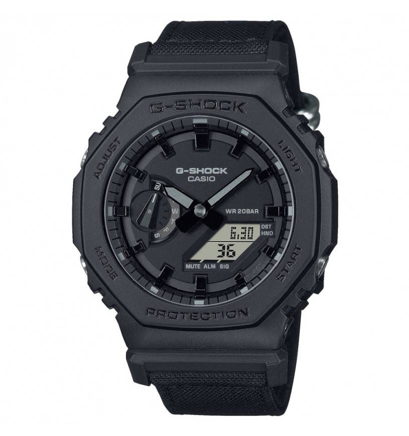 Practical yet eco-friendly, this G-SHOCK with resin case and fabric strap is perfect for all your needs. The all-black design is complemented by a strap made of eco-friendly Cordura nylon, creating a modern and versatile look, suitable for both the office and leisure. You can choose between three models: the iconic DW-5600, the GA-2100 with an octagonal case, or the GA-700 with a bold case.