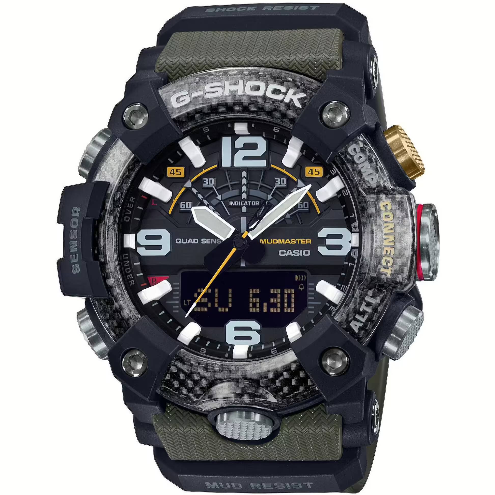 This is a model from the G-Shock Mudmaster series, designed for use in extreme environments with debris, dirt, and debris, and uses carbon materials. The use of high-rigidity carbon on the case keeps damage and deformation at bay and ensures a high level of airtightness and shock resistance. This model also features a filter that protects against mud ingress, a stainless steel back panel, and a shock-resistant fine resin backing embedded with glass fibers, giving it a high level of dust and mud resistance. Furthermore, the bezel uses three layers of fine resin with carbon fiber inserts and is designed to resemble a gas can like those found on off-road vehicles. Function-wise, this model is equipped with a compass, altimeter/barometer, temperature reader, and pedometer. In addition to being able to easily adjust the time using the dedicated G-Shock app, there are many other useful features, including Mission Log, which automatically records the app's altitude data from the watch and route data from your smartphone. This is a durable watch that helps you make quick decisions and take precise actions.