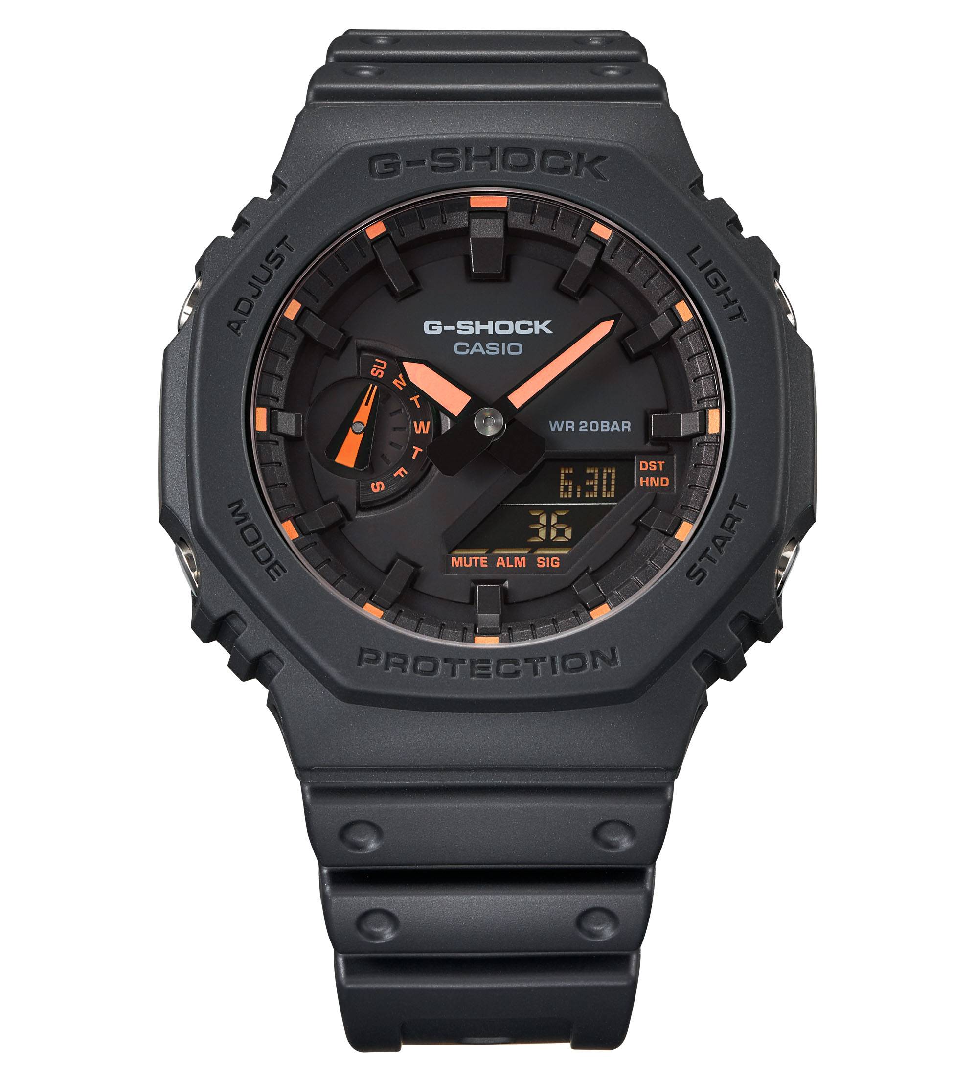 G-SHOCK, the indestructible watch brand, evolves in a never-ending pursuit of extreme strength and endurance. The 2100 model is a digital-analog combination that inherits the concept of the first-generation DW-5000C models, updating it with a modern octagonal design. Furthermore, the watch achieves a thickness of 11.8 mm thanks to an extremely rigid thin resin, strengthened by carbon fiber. The watch also features fluorescent details to enhance your look!