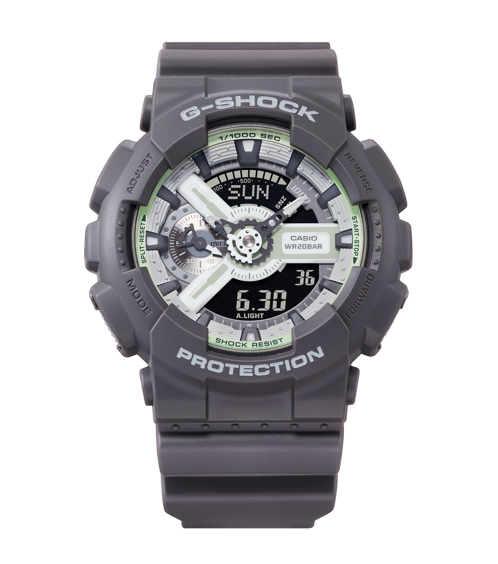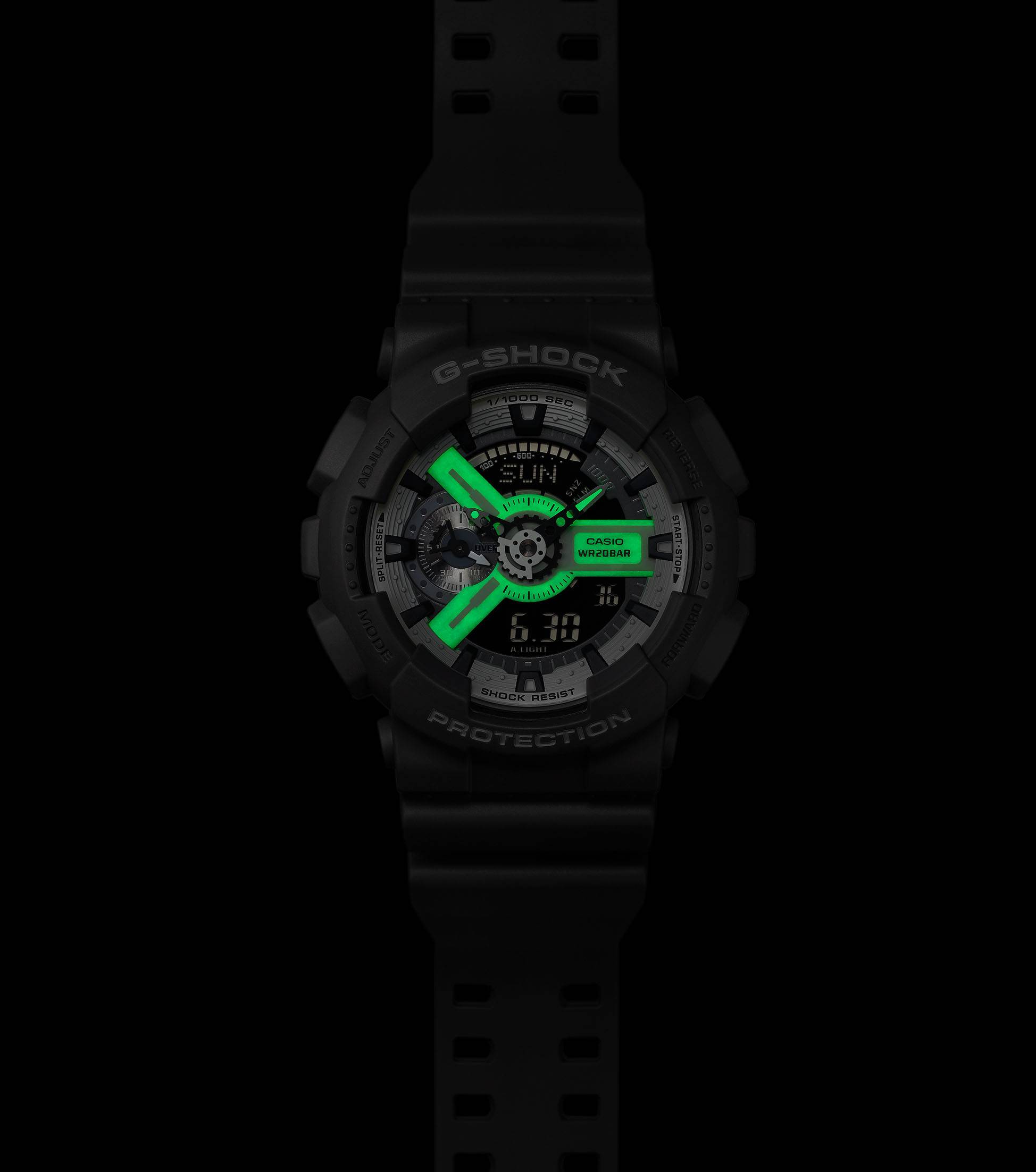Bring out your hidden side with the G-SHOCK “Hidden Glow” series that glows in the dark. All models feature luminescent parts within the dial that reveal a green glow in low-light situations, accentuating each model's distinctive design. Additionally, key watch components are crafted from bio-based resin, produced using renewable organic resources. The result is a monochrome gray-toned watch with a captivating fluorescent design.