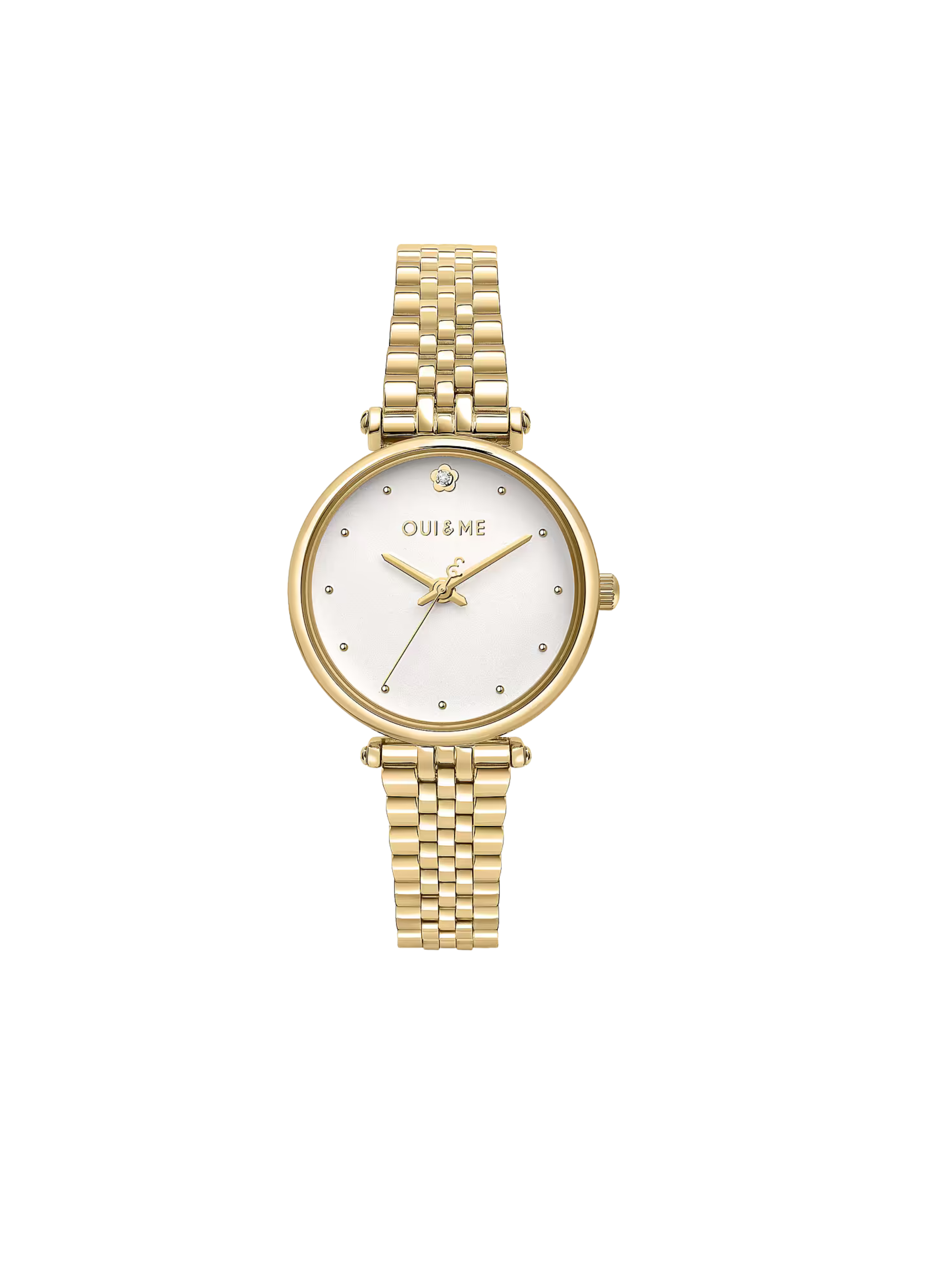 Gold-tone stainless steel case. Gold-tone stainless steel bracelet. Quartz movement. Mineral crystal. Case diameter: 33mm, thickness: 7.55mm. Water resistance: 5 ATM.